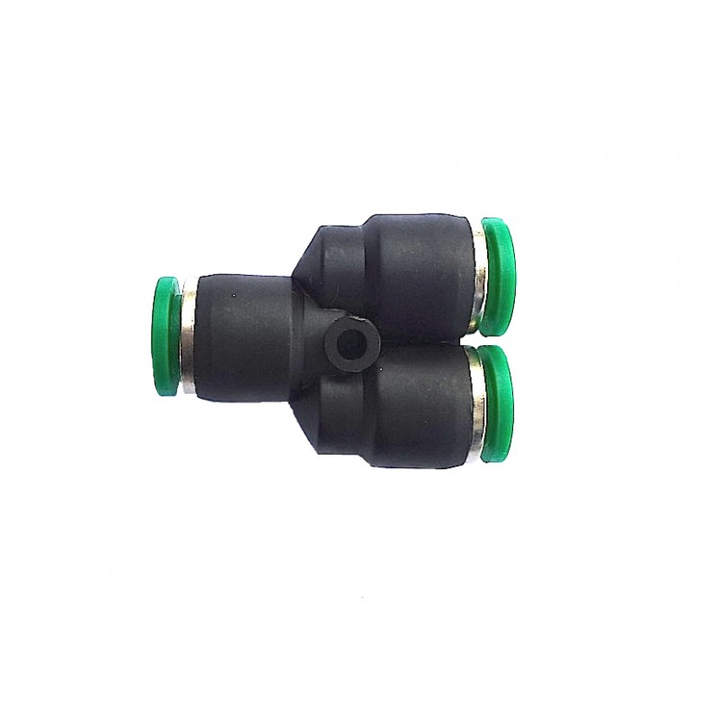 Переходник VEPA B267/2 предназначен для соединения разнородных пневматических компонентов с использованием цанговых разъёмов. Имеет Y-образную конфигурацию: один входной патрубок с цангой 8 мм и два выходных патрубка с цангами по 6 мм. Корпус выполнен из пластика.