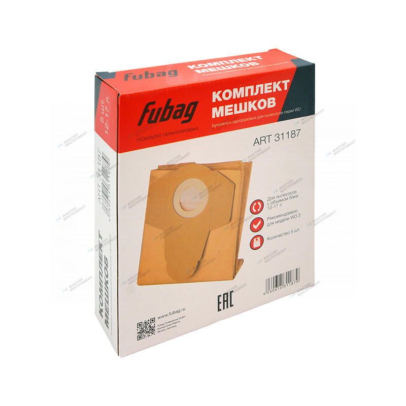 Комплект одноразовых мешков для пылесосов объёмом бака 12–17 литров. Подходит для моделей WD3. Изготовлен из бумаги. В упаковке — 5 штук.