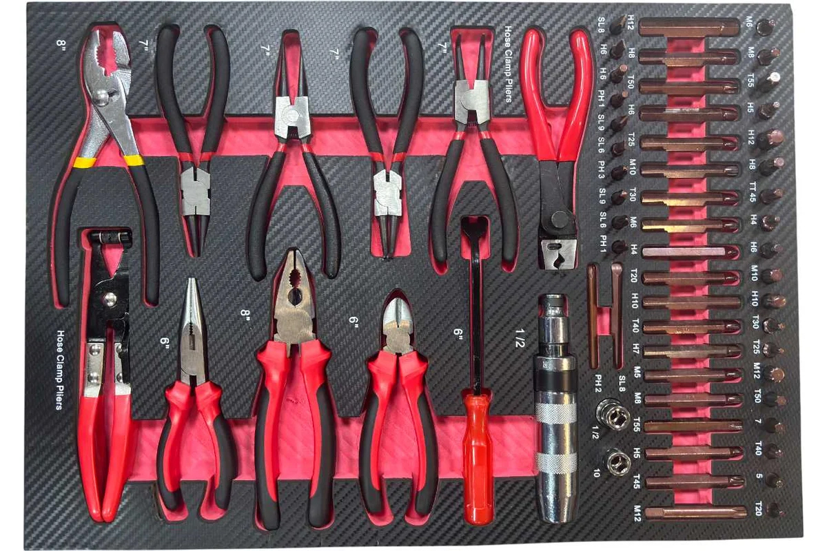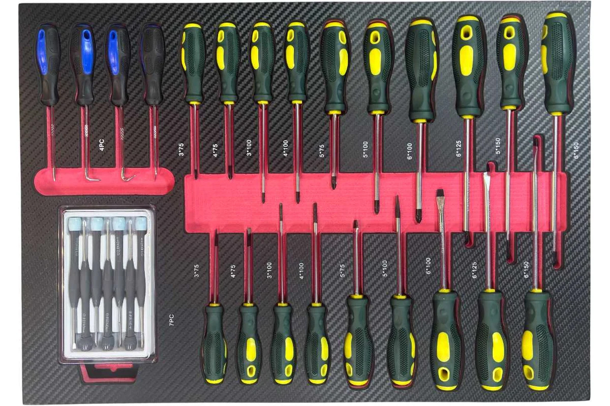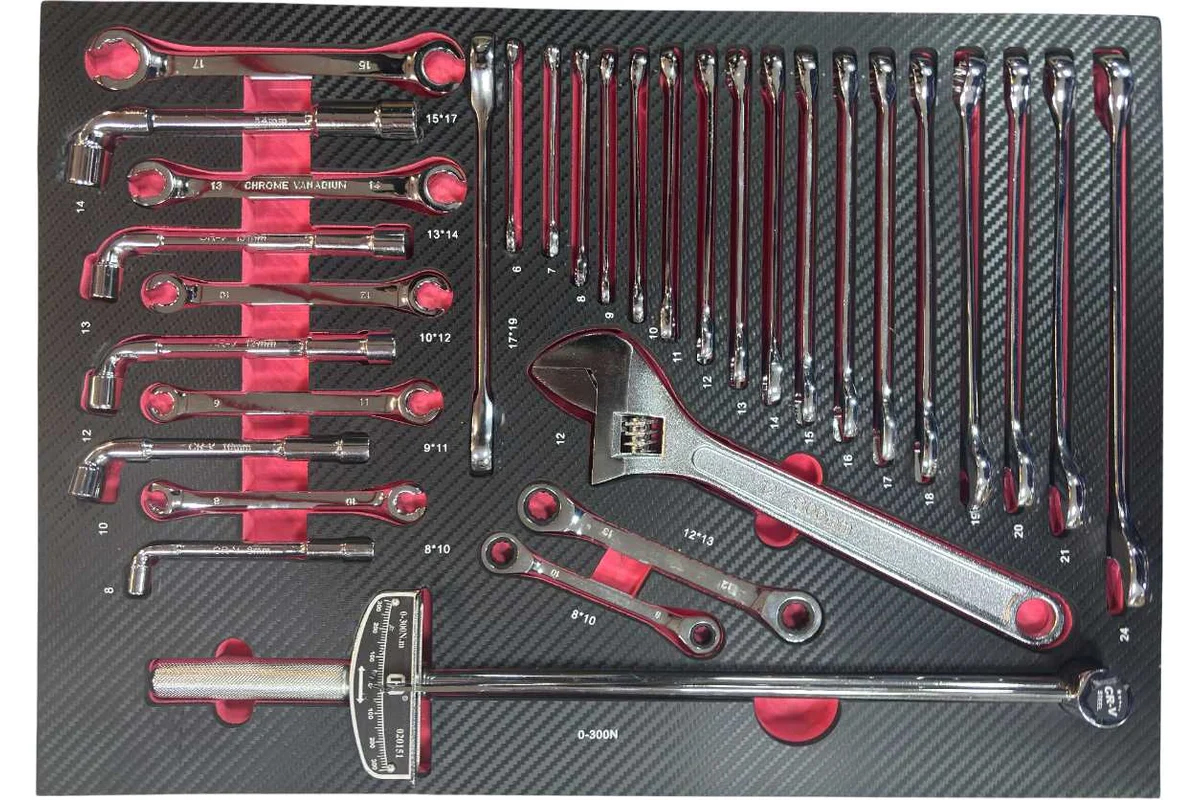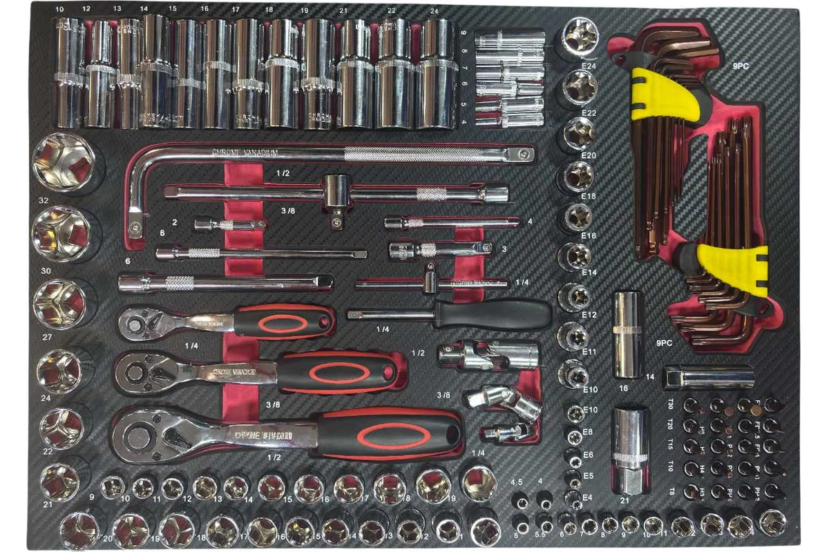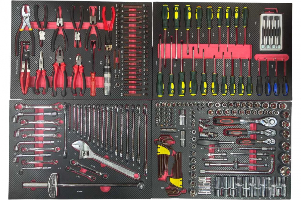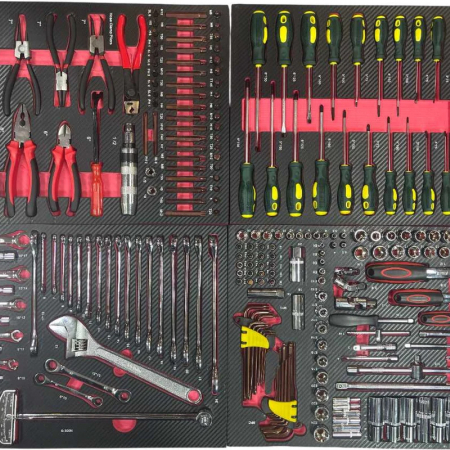 Набор поставляется в удобном ложементе, который может быть размещен в инструментальной тележке или использоваться как отдельное место хранения инструментов. 255 предметов.