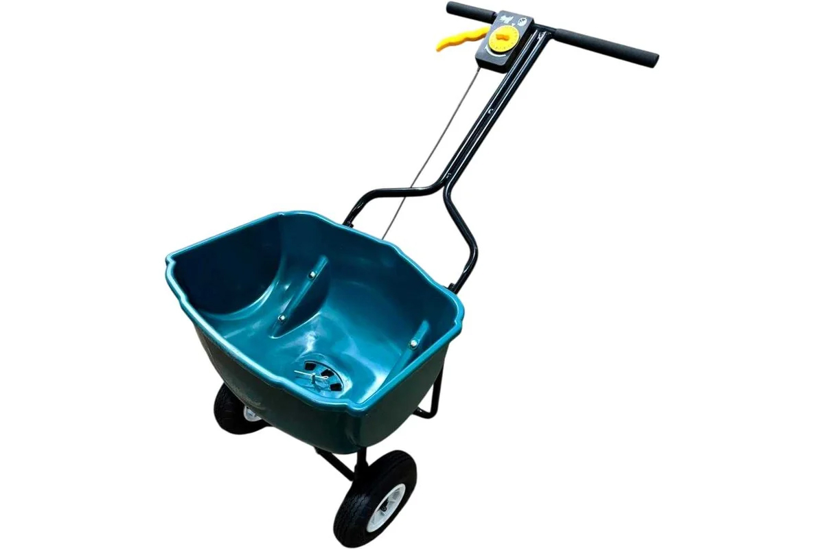 Тележка дозатор 27л разбрасыватель-сеялка применяется для дозированного разбрасывания антигололедных реагентов (песок, соли и тд), а также для разбрасывания минеральных и органических удобрений для газона и не только, тележка-дозатор сеялка для семян.
