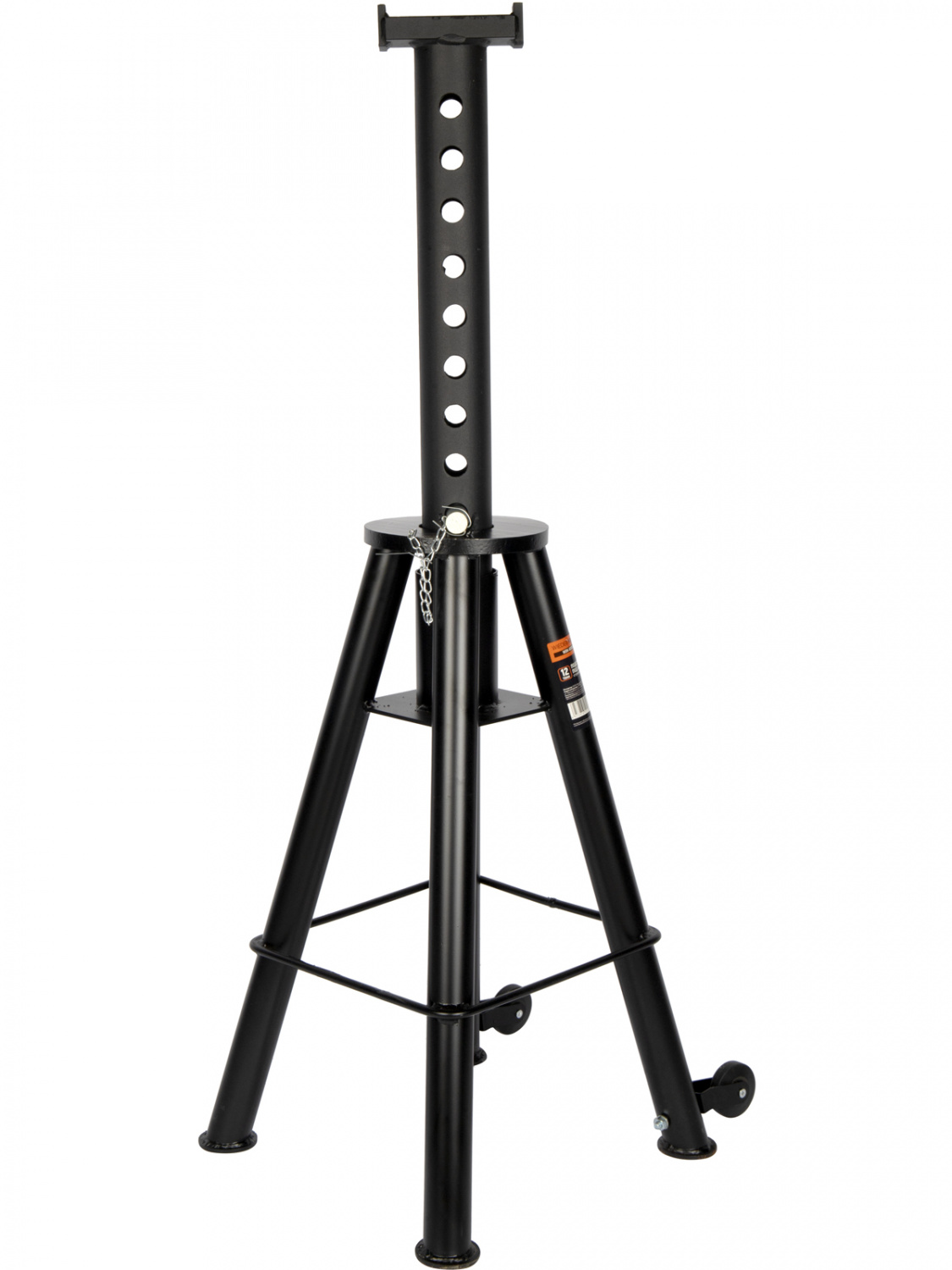 Регулировка высоты осуществляется при помощи выдвижной стойки с отверстиями и фиксирующего штифта. Массивный стопорный штифт надёжно удерживает штангу в выбранном положении. Конструкция выполнена из прочной стали и обеспечивает устойчивую опору и безопасную работу при обслуживании тяжёлого транспорта.