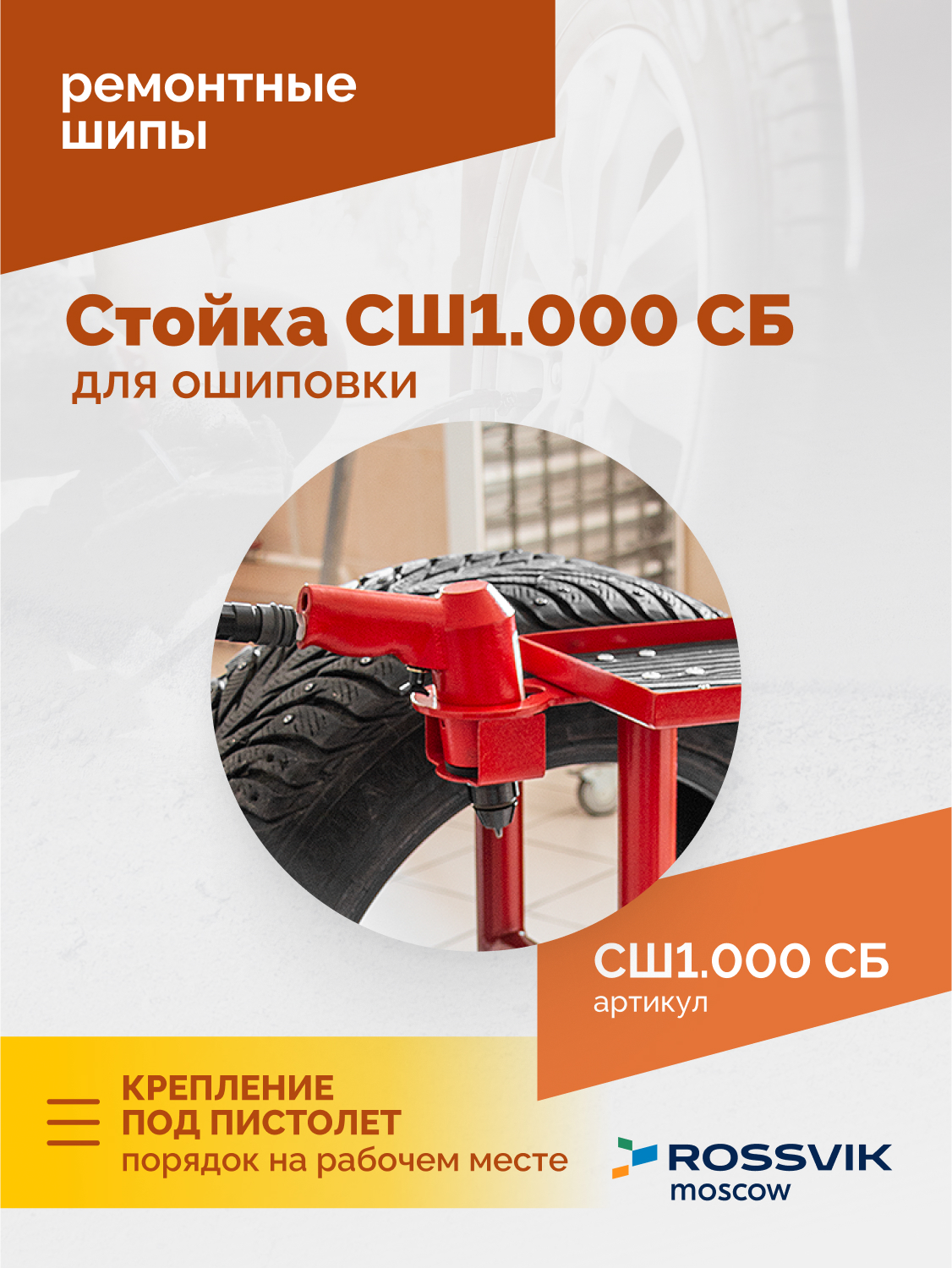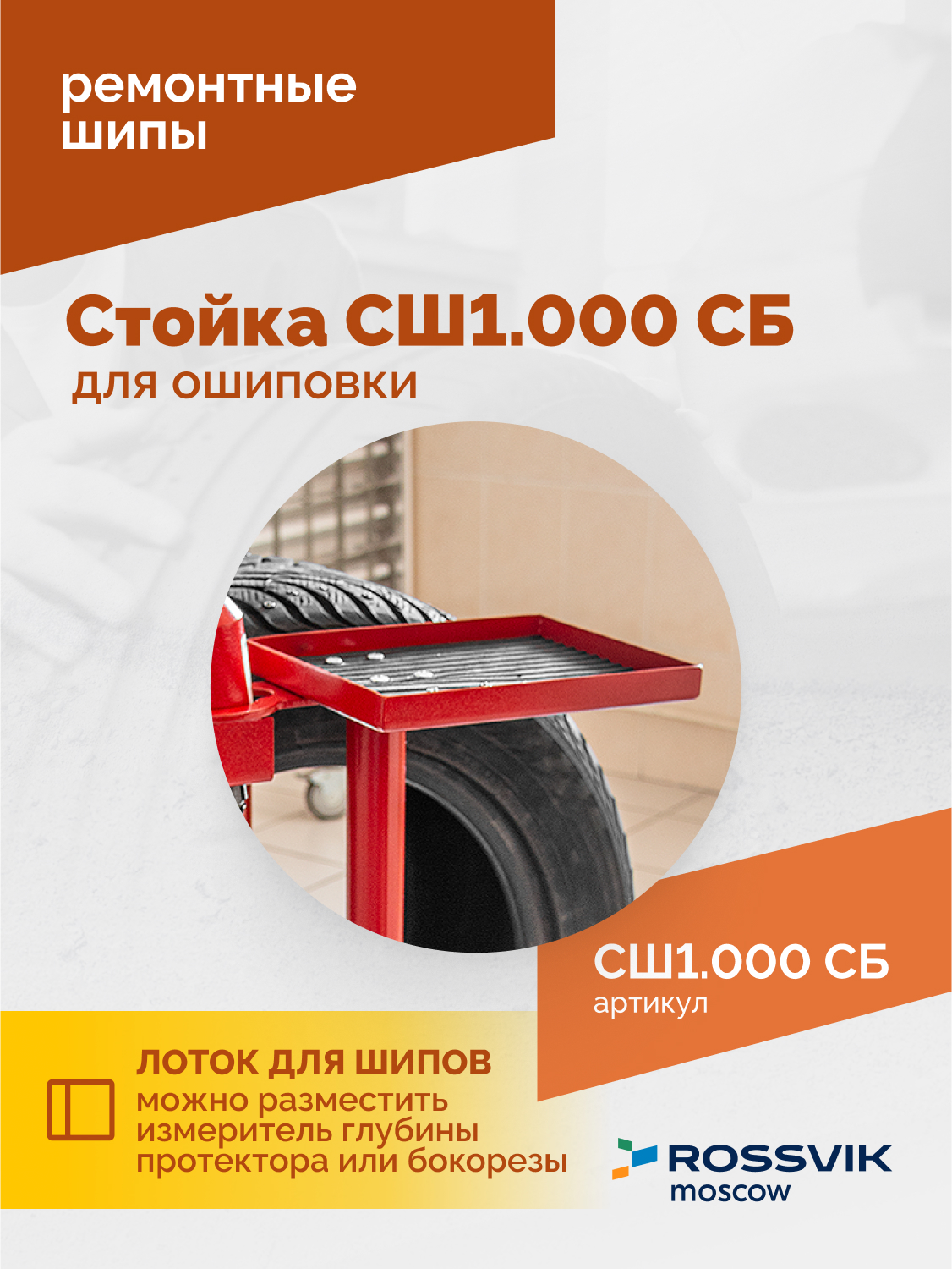 Стойка для ошиповки СШ1.000 СБ<br />Размер устанавливаемых шин 13–24"<br />Габаритные размеры (ДхШхВ), не более 482х400x883 мм<br />Вес 16,5 кг<br />Упрошает и облегчает процесс процесс установки шипов в шину.<br />Стойка предназначена для ошиповки шин без колесного диска. Удобный упор стойки, повторяющий контур внутренней поверхности шины, позволяет жестко фиксировать область ошиповки. При установке шипов резина протектора не проминается.<br /><br />Стойка имеет специальное крепление под пистолет для ошиповки и лоток для шипов. В лотке, также можно разместить измеритель глубины протектора шин, бокорезы и другие подручные средства.