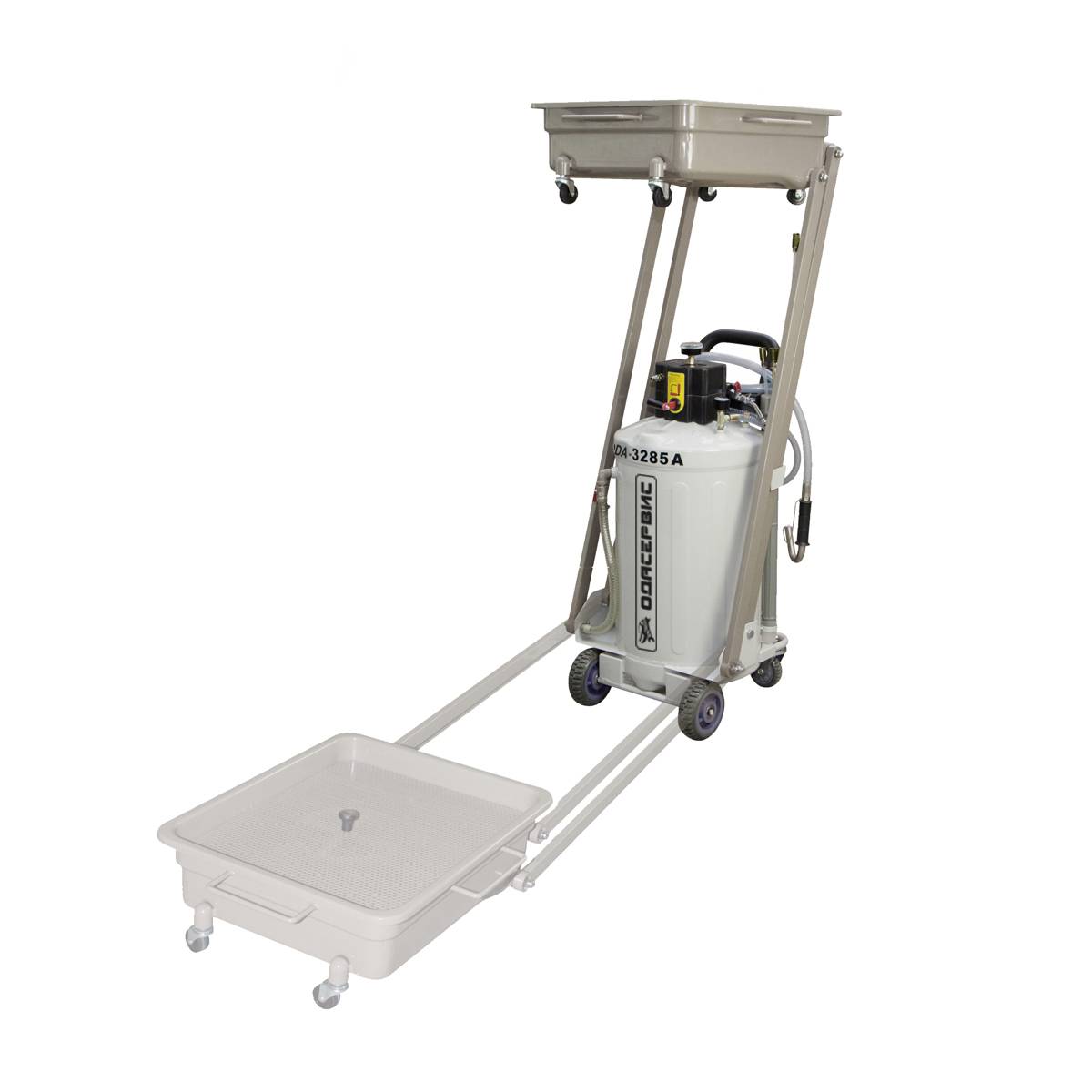 ODA-3285A - установка для слива масла с пантографной ванной предназначен для использования в смотровой яме, под подъёмником или на полу. Сбор масла осуществляется путем подключении внешнего компрессора (поставляется отдельно). Прямоугольный подкатной лоток для слива самотёком и набор маслосборных щупов для принудительного удаления масла. Слив отработанного масла из ванны производится в основной резервуар.