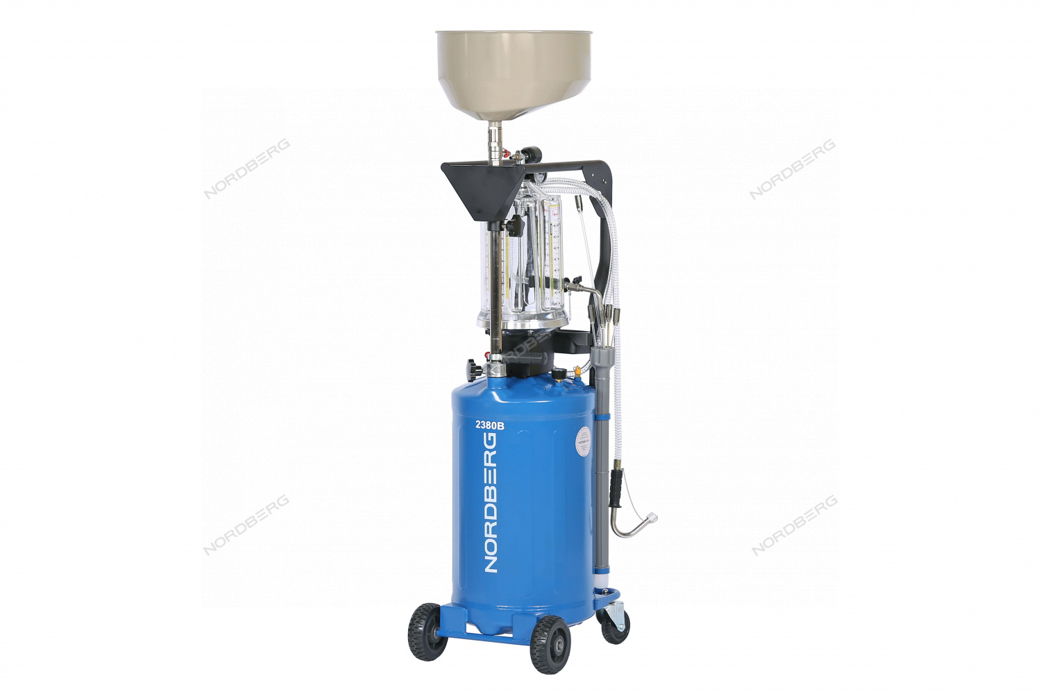 Установка для замены масла NORDBERG (2380) 2380B удаляет отработанное масло и другие жидкости из любого транспортного средства при помощи вентури-вакуумной вытяжной системы.