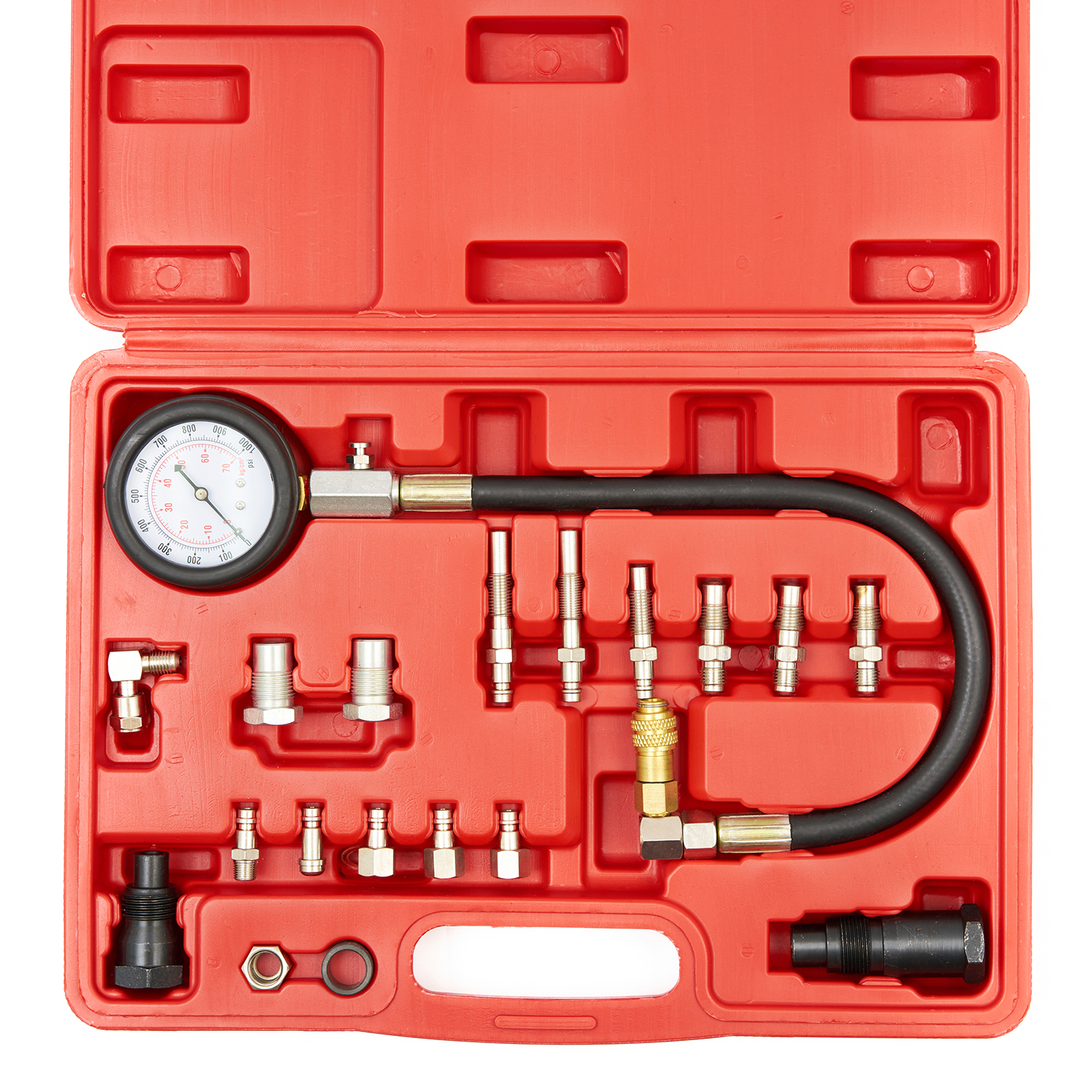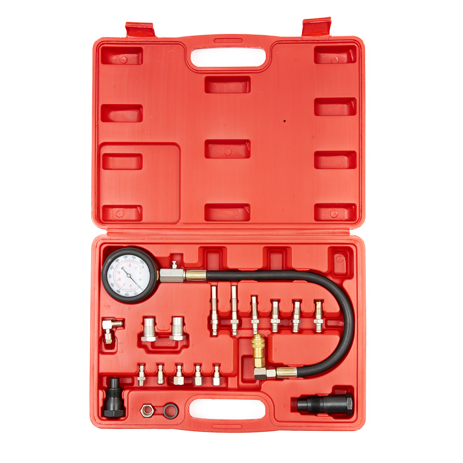 ST107 Компрессометр для дизельных ДВС с быстросъемными адаптерами, 0-1000PSI (0-70бар) используется во время сезонного техосмотра автомобиля или во время ремонта по причине возникновения неполадок в системе подачи топлива (поршень, цилиндр). Благодаря большому количеству адаптеров, входящих в комплект, проверку давления рабочей жидкости можно осуществлять в большинстве существующих автомобилей, оснащенных дизельным двигателем.