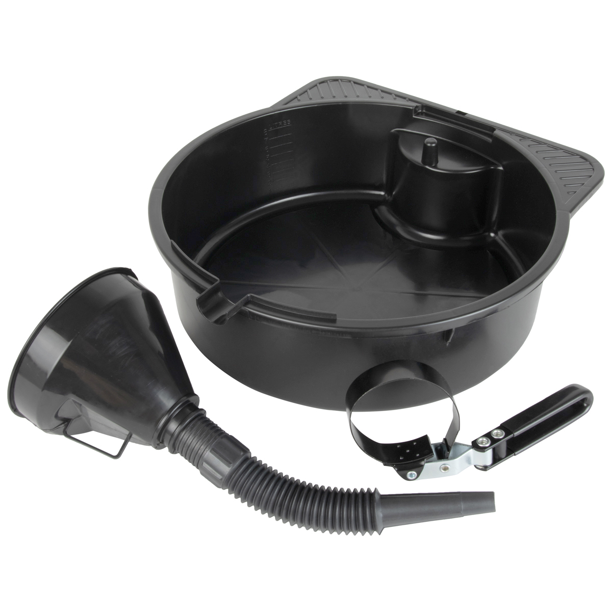 Поддон для сбора отработанного масла и других жидкостей. Имеет специальный носик для слива масла и крепление для масляного фильтра – можно повесить снятый фильтр, чтобы остатки масла стекли в поддон без лишних капель и грязи.