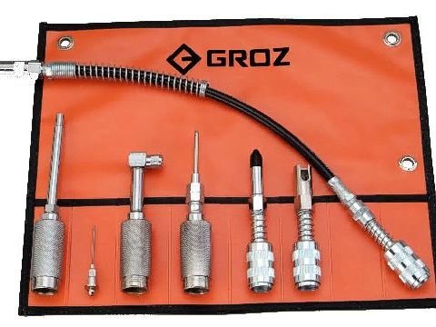 Содержит набор быстросъёмных насадок для различных видов смазочных работ: для работы с обычными и угловыми пресс-маслёнками, смазки закрытых подшипников, нагнетания смазки в труднодоступные места.