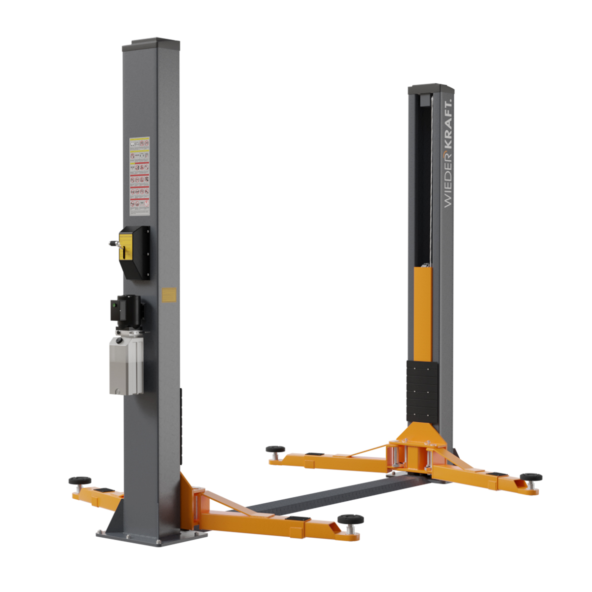 Подъемник двухстоечный с нижней синхронизацией 4 тонны WiederKraft WDK-522 с односторонней механической разблокировкой отличается усиленной конструкцией элементов: двойной защитный трап, шкивы увеличенного диаметра, толщина металла 6 мм (на 20% больше, чем у аналогичных моделей) - обеспечивает жесткость и устойчивость колонн подъемника.