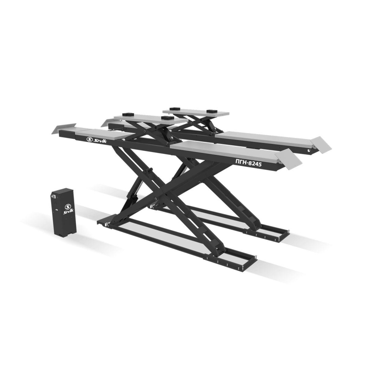 Встроенный в гладкие платформы ножничный подъемник второго уровня для вывешивания колес автомобиля имеет: