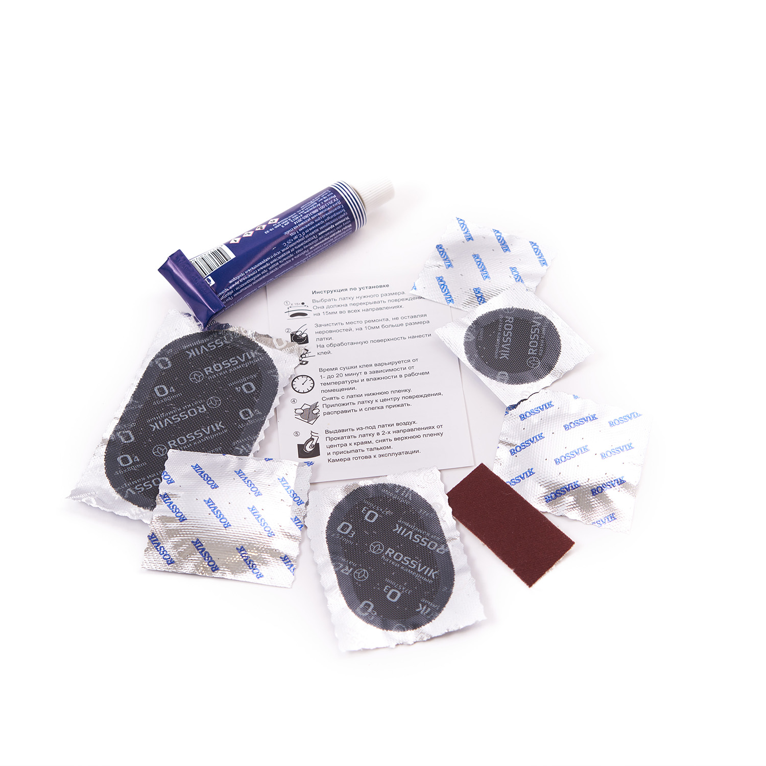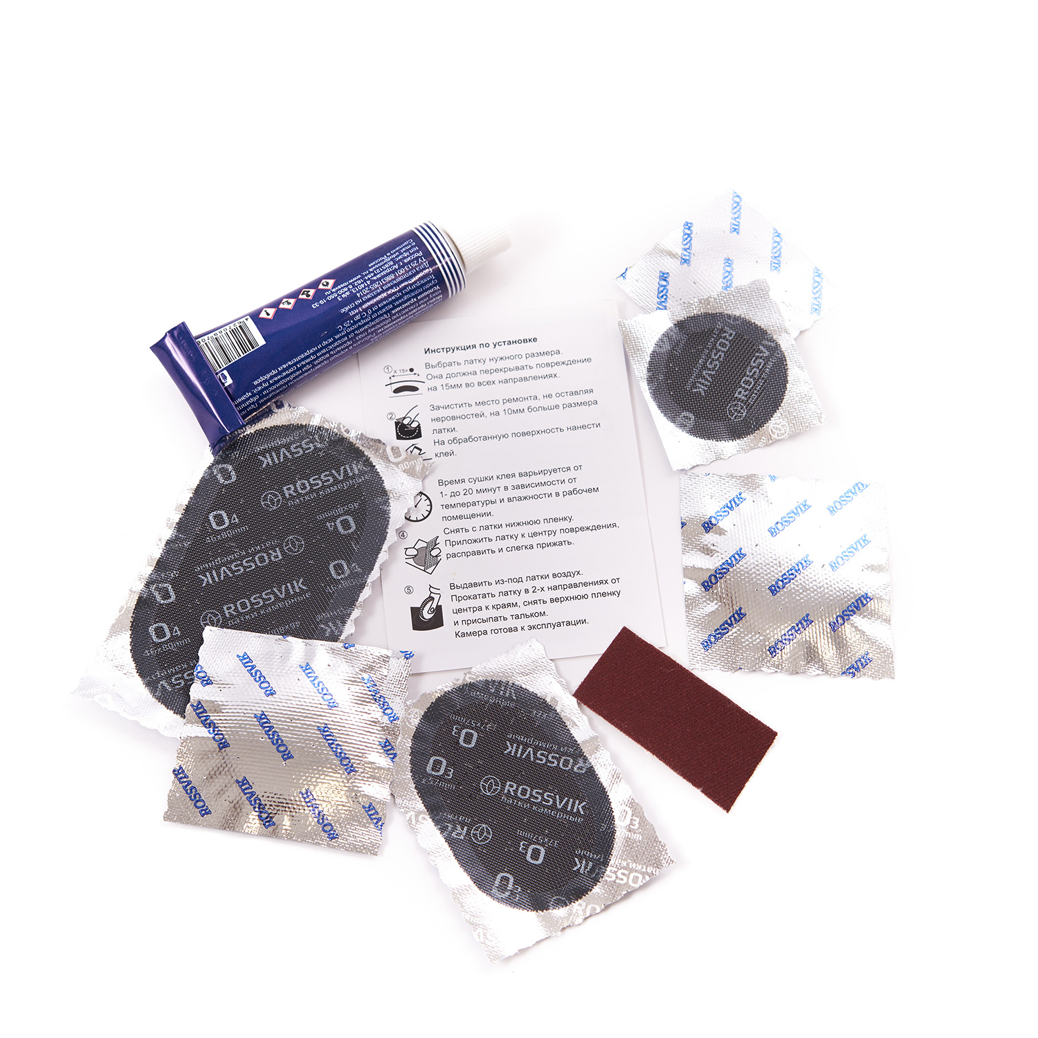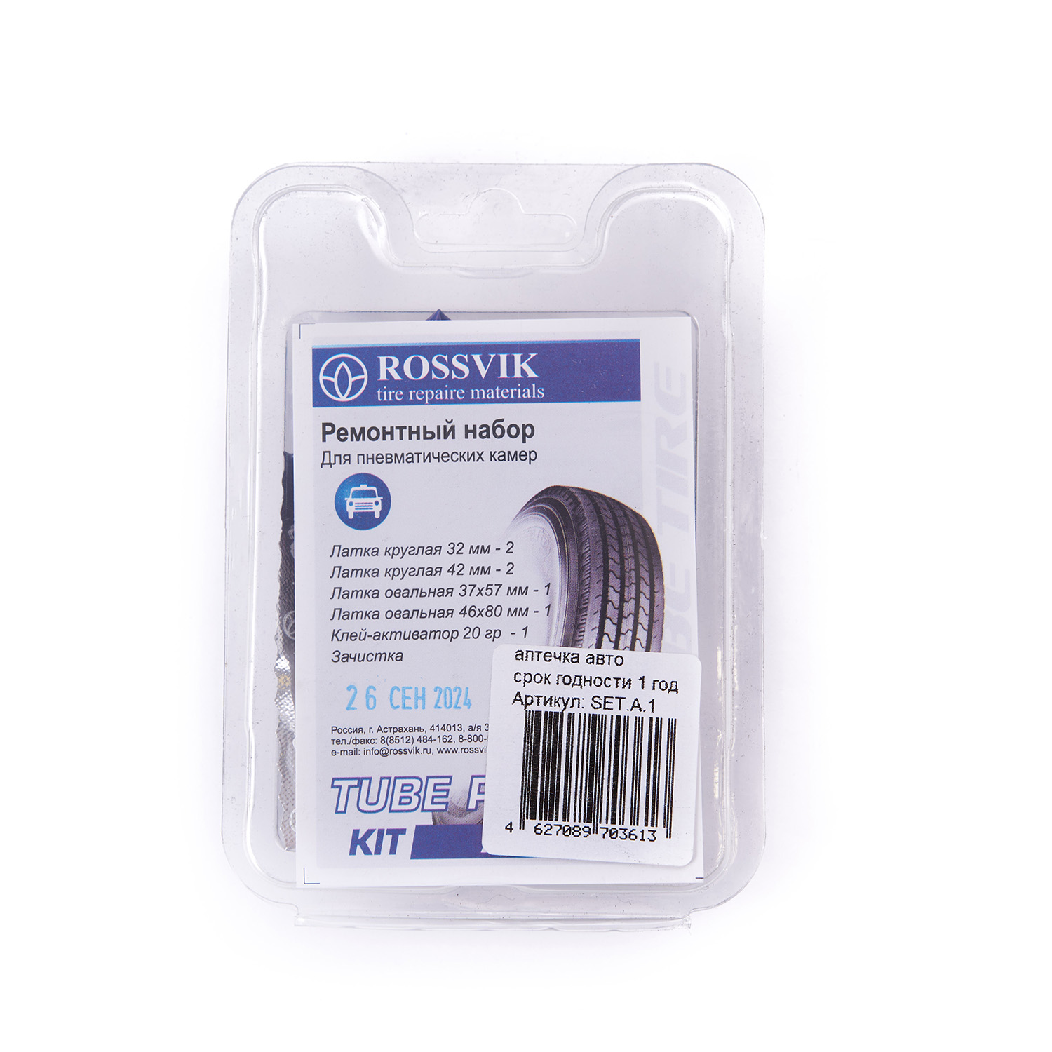 Аптечка авто от бренда Rossvik представляет собой ремонтный набор, предназначенный для пневматических камер.