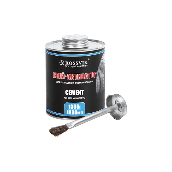 Объём 1000мл/1300г (банка с кистью) Универсальный клей-активатор ROSSVIK применяется для ремонта камер и шин латками, грибками, жгутами и кордовыми пластырями методом “холодной” вулканизации. Состав негорючий, термостойкий, быстросохнущий. Содержит активаторы “холодной” вулканизации резины.