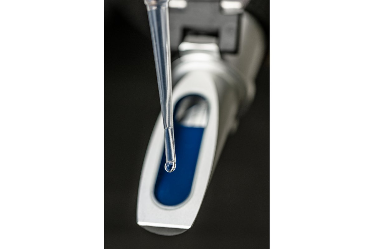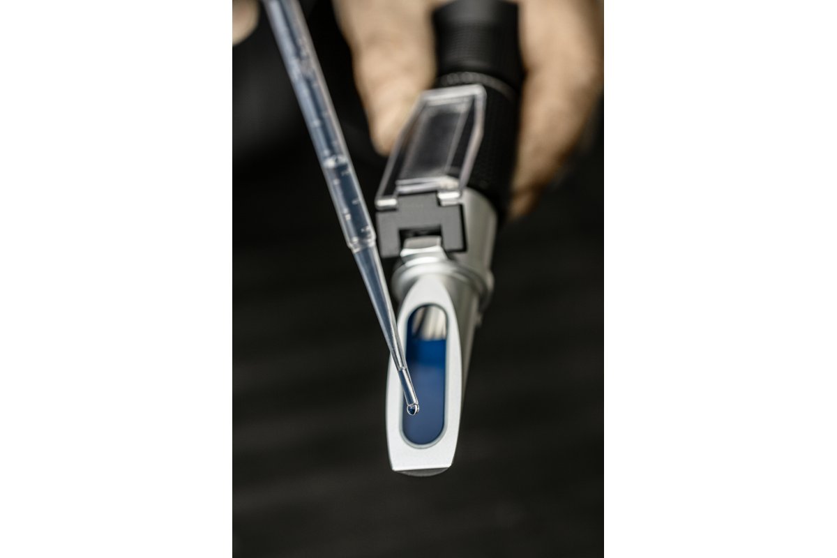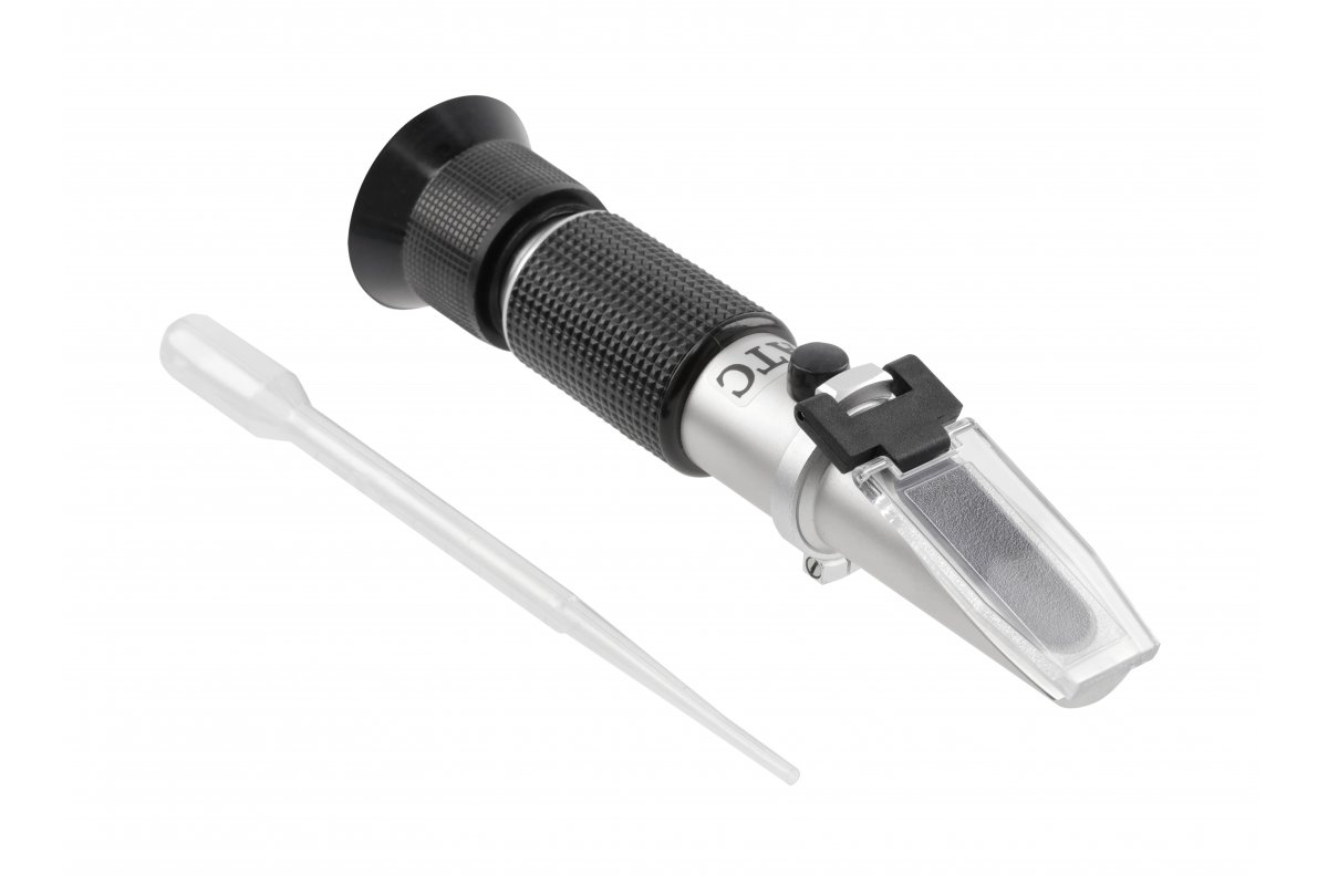 Рефрактометр, используемый для измерения свойств жидкостей, таких как морозостойкость или плотность электролита. В основном используется в профессиональных мастерских и автосервисах.