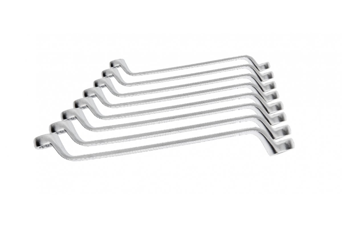 OписаниеНабор изогнутых накидных ключейXарактеристика• ключи изготовлены из высококачественной легированной стали CrV• устойчивые к деформации• штампованная ковка• размеры и формы соответствуют европейскому стандарту DIN 838• упакованы в практичный тканевый чехол и в ящик с возможностью подвешивания