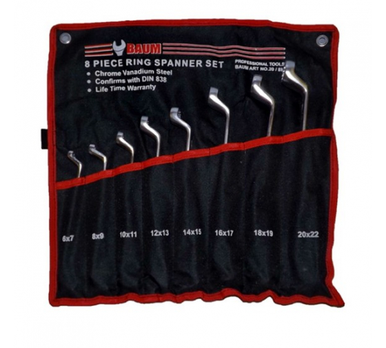 Набор накидных ключей BAUM 8 предметов 20-08M предназначен для проведения работ с крепежными изделиями, имеющими стандартный внешний 6 -12-гранный профиль.