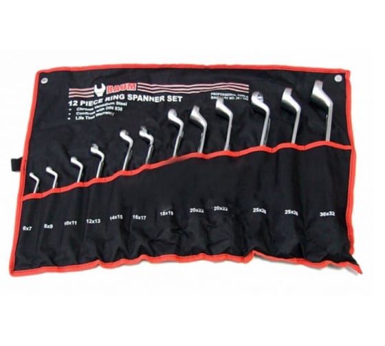 Данный набор состоит из 12 двусторонних накидных ключей, имеющих 12-гранный профиль, это делает их более универсальными. Захватные накидные петли всех ключей отогнуты ступенькой на 75°, что позволяет работать в углублении.