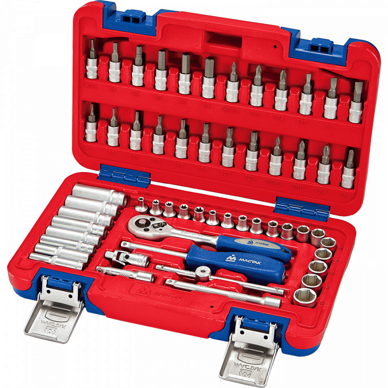 Головки торцевые стандартные 6-гранные 4, 4.5, 5, 5.5, 6, 7, 8, 9, 10, 11, 12, 13, 14 мм Головки торцевые глубокие 6-гранные 6, 7, 8, 9, 10, 11, 12, 13 мм Головки торцевые TORX Е-стандарт E4, E5, E6, E7, E8 Трещотка флажковая с кнопкой 45 зубцов, длина 125 мм Вороток скользящий Т-типа длина 115 мм Удлинители стандартные 50, 100 мм Кардан 40 мм Отвертка-вороток 150 ммНасадки торцевые 1/4" (6.35 мм)