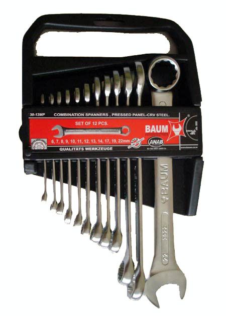 Набор комбинированных ключей BAUM в пластиковом держателе включает 12 штук с гнездом и отвёрткой на каждом конце. Размеры ключей охватывают диапазон от 6 мм до 22 мм.