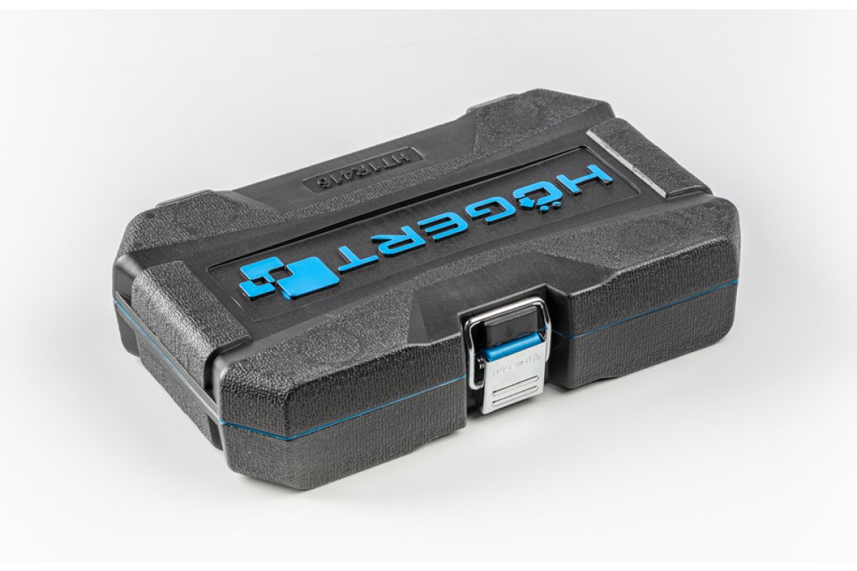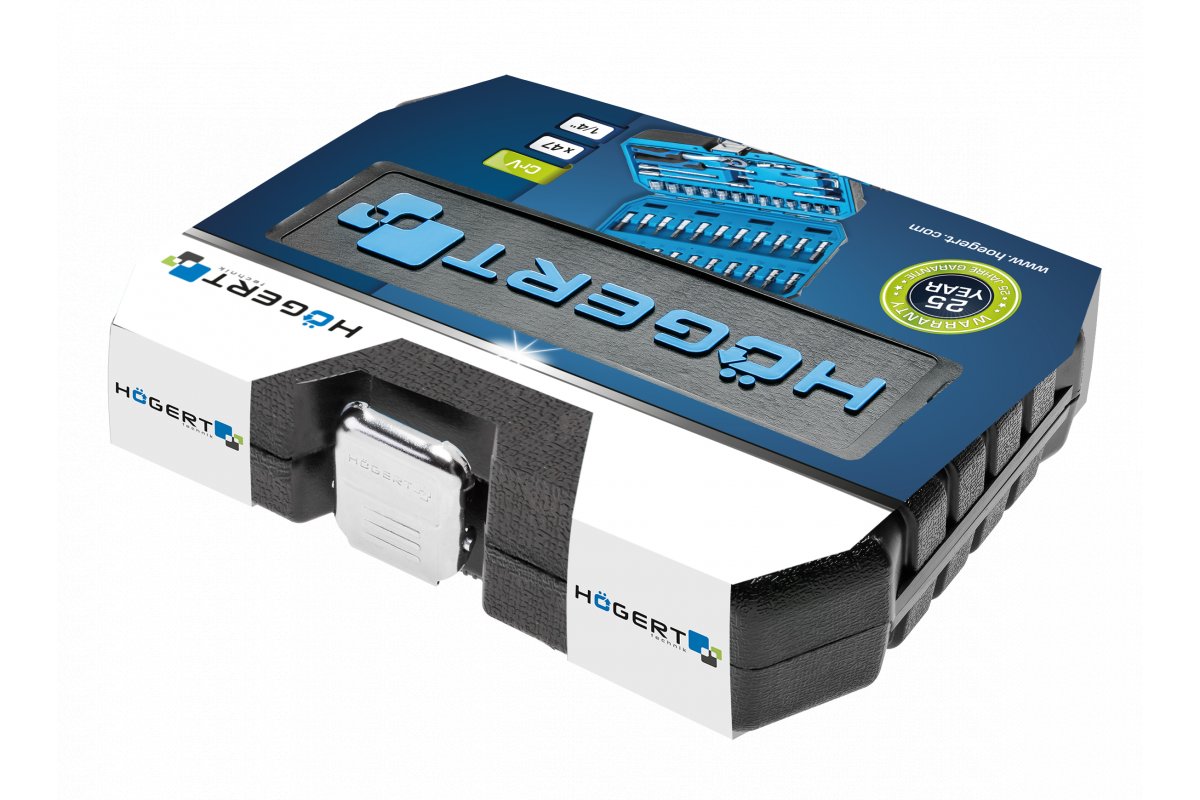 Набор инструментов HOEGERT состоит из 46 элементов и предназначен для работы с деталями типа 1/4". В комплект входят торцевые головки, отверточные биты и дополнительные аксессуары, обеспечивающие удобство при выполнении различных задач.