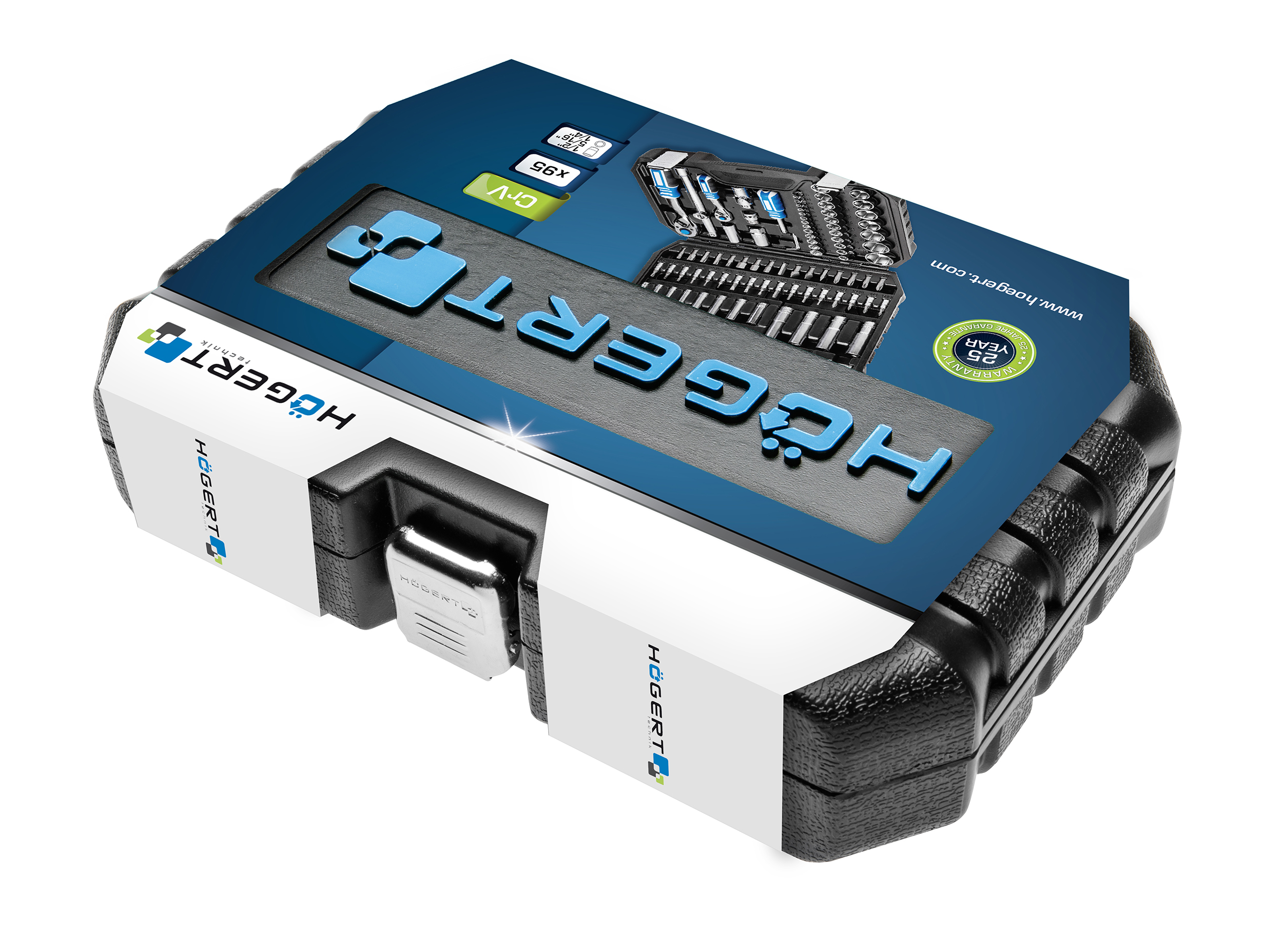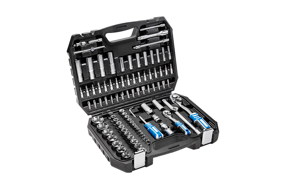 Набор инструментов HOEGERT включает 95 элементов и предназначен для работы с динамометрическими ключами и другими приспособлениями, использующими стандартные размеры шлицев — 1/4″ и 1/2″.