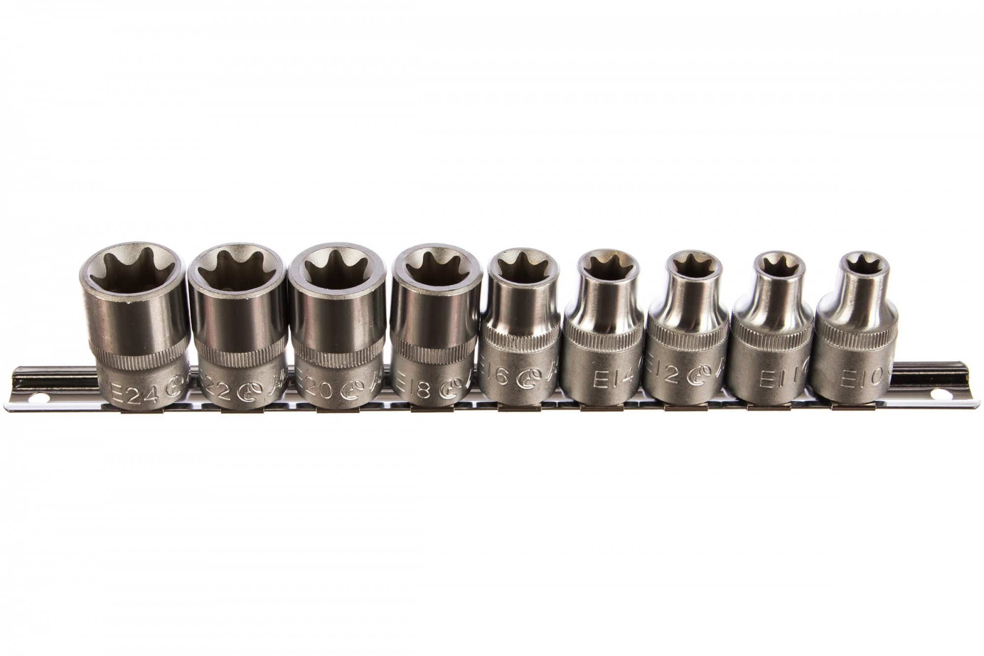 Набор состоит из 9 торцевых головок длиной 38 мм: E10, E11, E12, E14, E16, E18, E20, E22, E24.