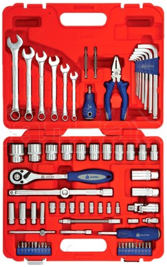 В составе набора: головки торцевые стандартные шестигранные, головки торцевые глубокие шестигранные, головки торцевые шестигранные для свечей зажигания с резиновым фиксатором, удлинители стандартные, карданы, плоскогубцы комбинированные, отвёртка 4 в одном, вставки, шестигранники L-образные, длинные с шаровым окончанием