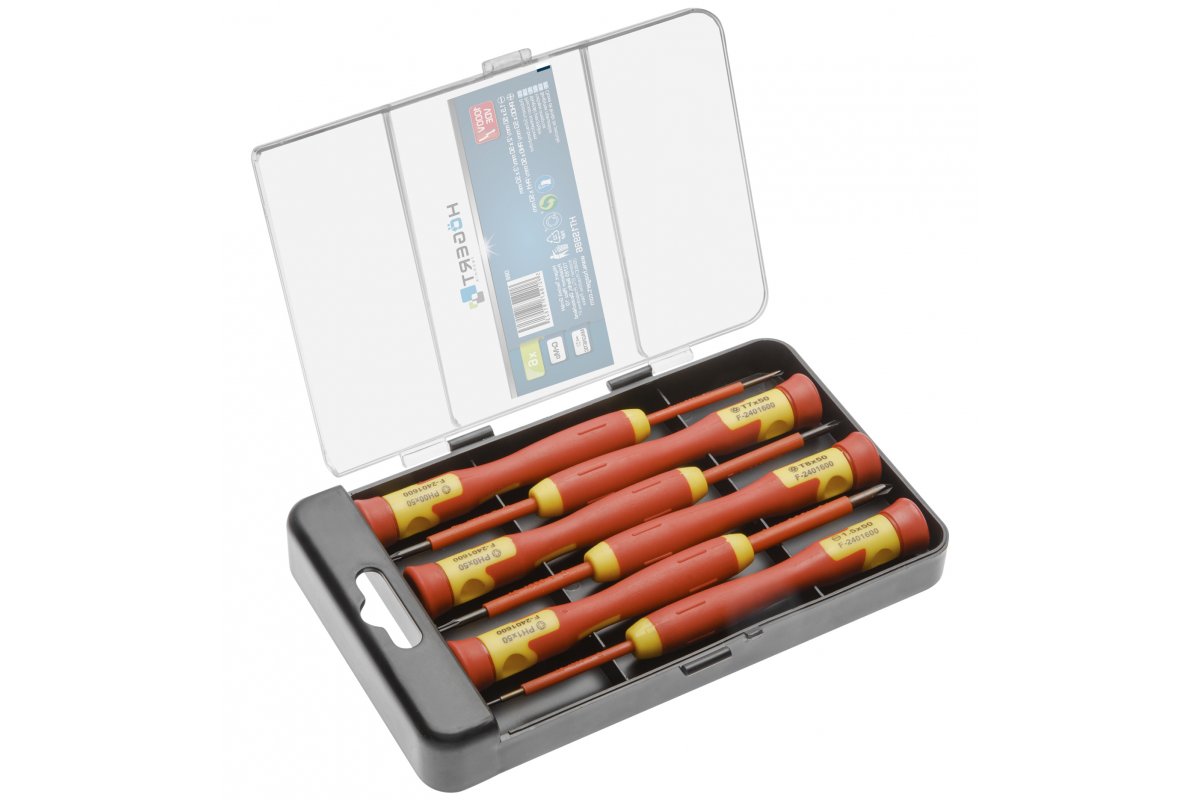 Набор прецизионных диэлектрических отверток HOEGERT предназначен для работы под напряжением до 1000 В и сертифицирован в соответствии с требованиями электробезопасности. Изготовлен из хром-молибденовой стали (CrMo), обеспечивающей прочность и износостойкость инструмента. В комплект входят 6 отверток, подобранных для точных и деликатных задач.