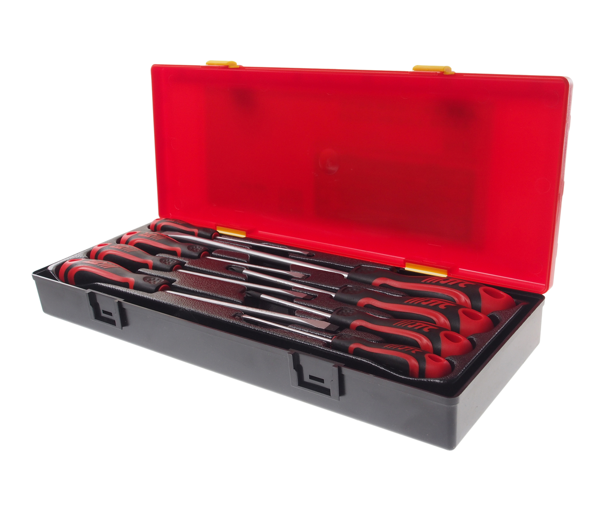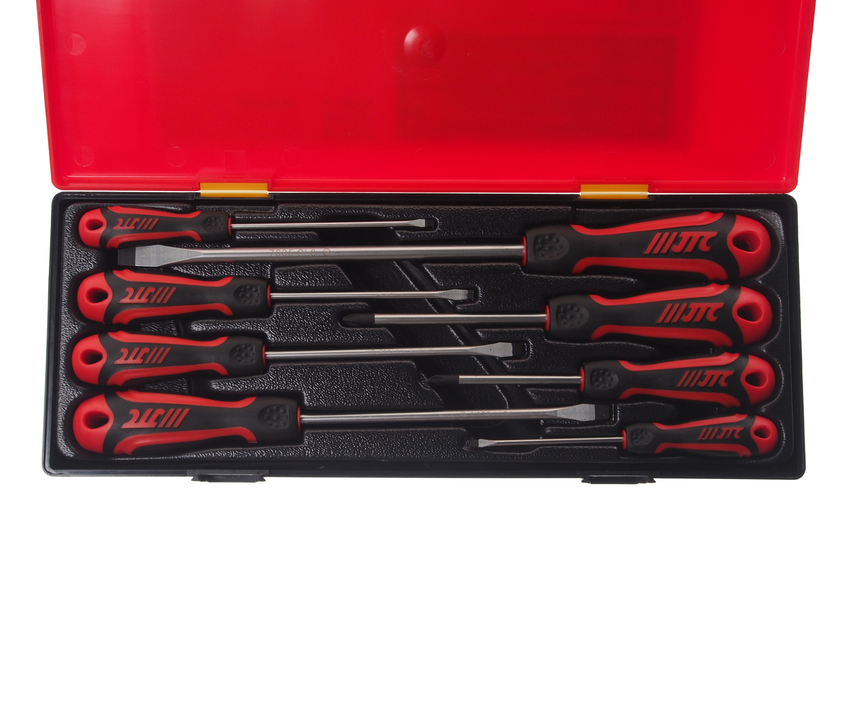 Набор отверток JTC включает 8 предметов: 6 штук с плоским шлицом (SL) и 2 штуки с крестообразным шлицом Phillips (PH). Предназначен для выполнения работ, требующих использования стандартных типов отверток.