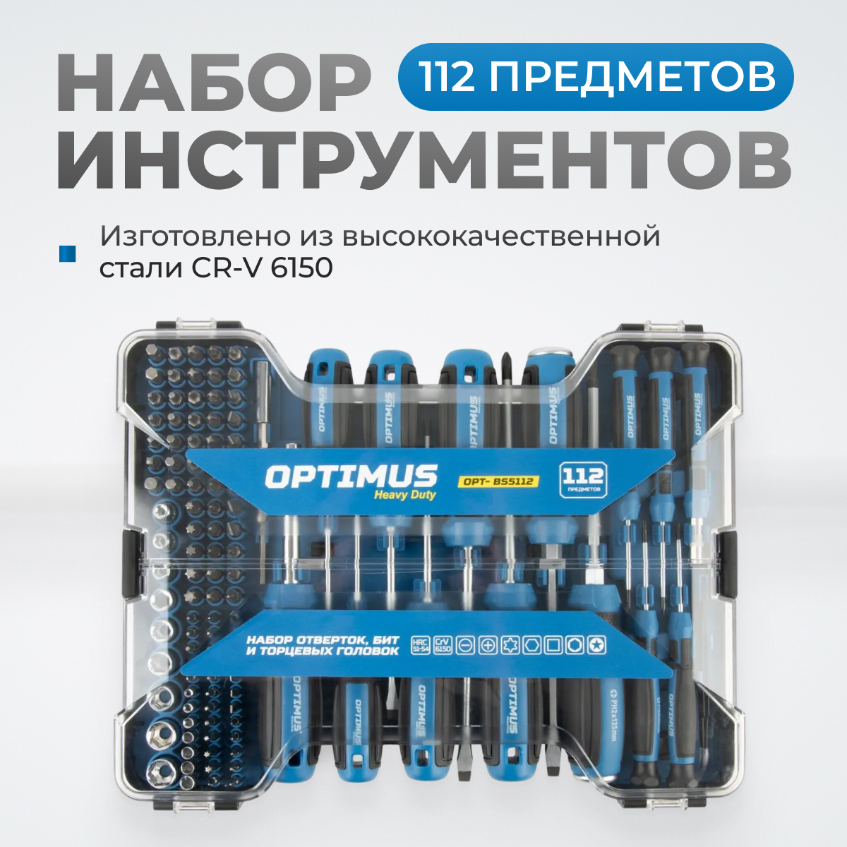 Набор OPT-BS5112 от бренда OPTIMUS включает 112 предметов: отвертки, биты и торцевые головки. Комплектация предназначена для выполнения разнообразных задач по завинчиванию и отвинчиванию крепежа с различными типами шлицев.