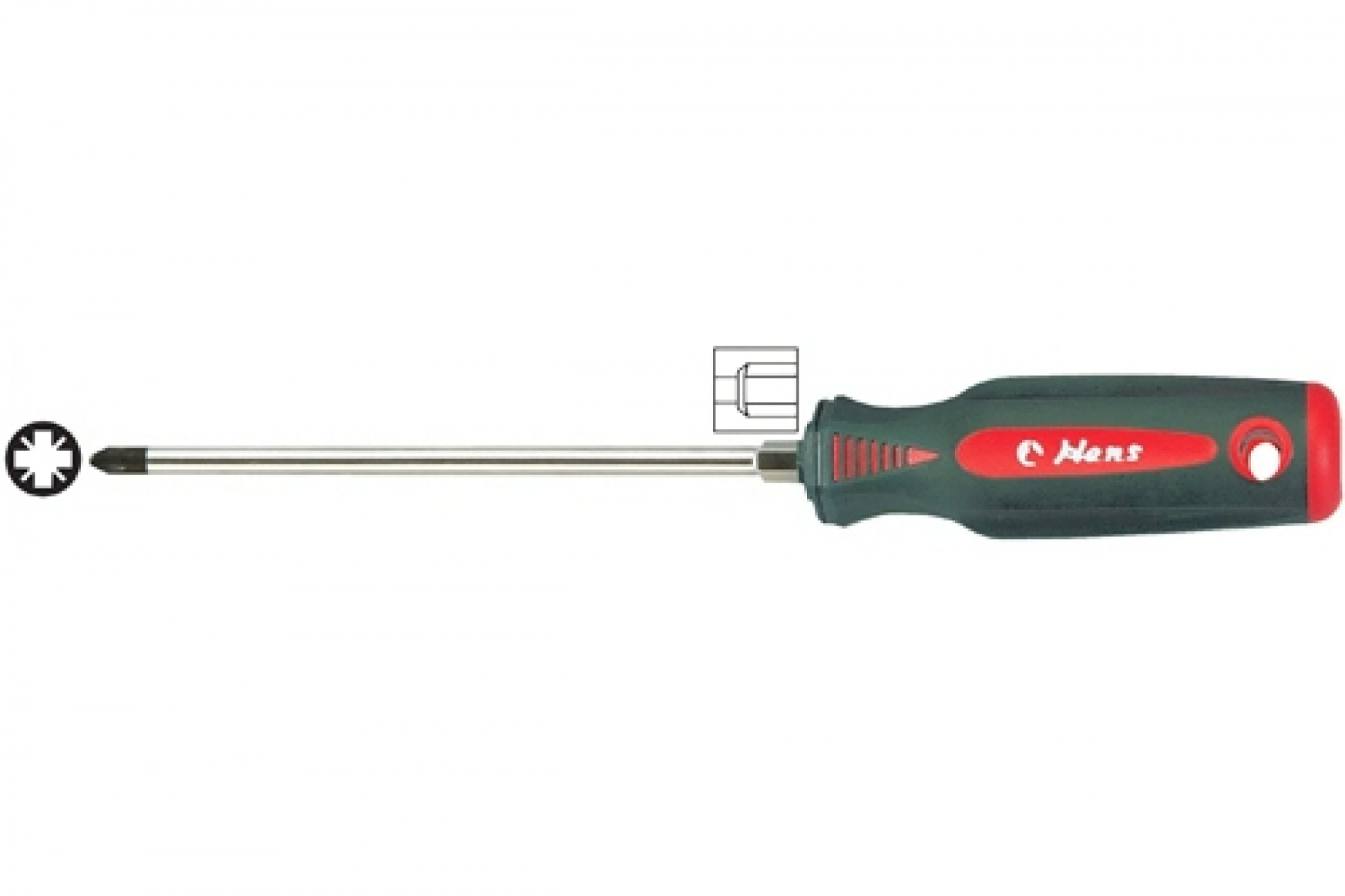 Силовая отвертка Hans Pozidriv - это ручной инструмент с крестовым шлицем. Стержень отвертки изготовлен из прочной стали. Рукоятка выполнена из двухкомпонентного материала, который не скользит в руке во время работы.