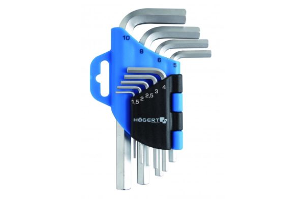 Набор коротких шестигранных Г-образных ключей HOEGERT включает 9 штук с диаметрами от 1,5 до 10 мм. Ключи изготовлены из высокосортной хромованадиевой стали (CrV), обеспечивающей прочность и износостойкость при работе с шестигранными винтами и болтами. Компактная форма Г-образного ключа позволяет эффективно использовать инструмент в ограниченном пространстве. Подходит для сборки мебели, ремонта техники и других задач, требующих точного воздействия на шестигранные крепёжные элементы.