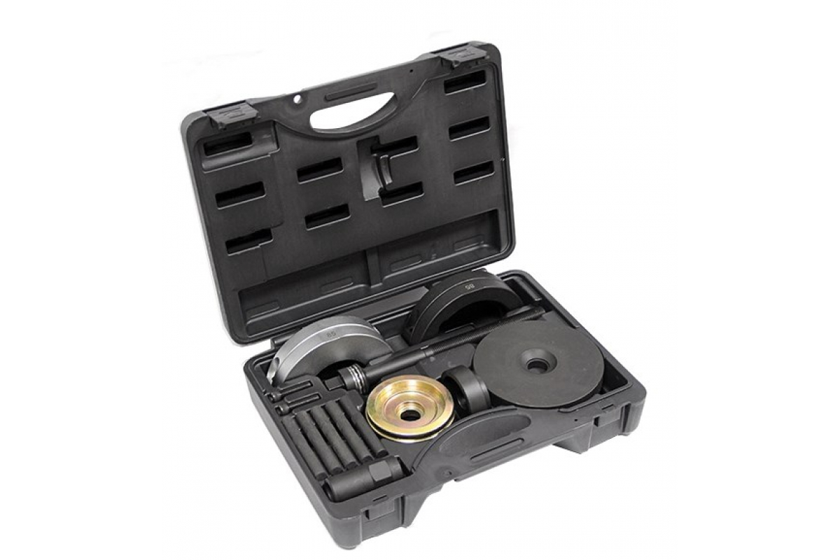 Набор оправок для монтажа и демонтажа ступичных подшипников 16 предметов МАСТАК 100-30016C выполнен из инструментальной стали. Все элементы набора покрыты хромом, либо имеют оксидированное покрытие. Диаметр обойм - 85 мм. Оправки применяются для ступичных подшипников диаметром 72 мм для: Фольксваген (Volkswagen) T5 / VW Touareg / Multivan.