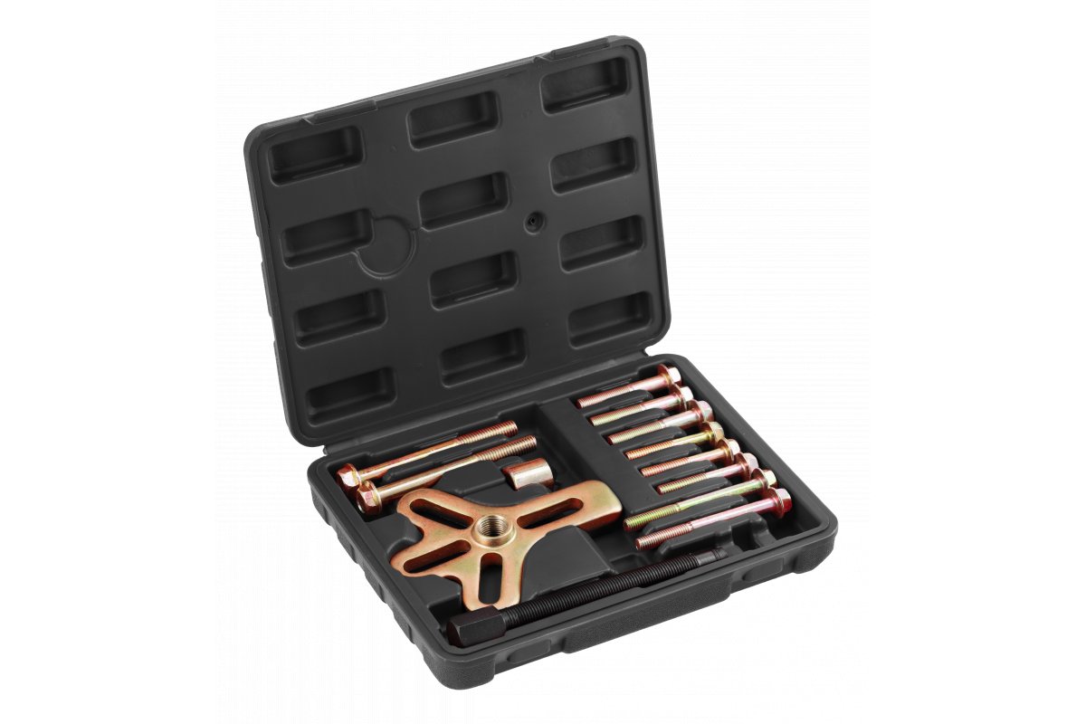 Набор съёмников ступиц 13 предметов от бренда HOEGERT представляет собой универсальное решение для демонтажа ступиц и подшипников. Комплект разработан для использования в условиях автосервиса и подходит для выполнения работ, связанных с разборкой узлов колёсной опоры.