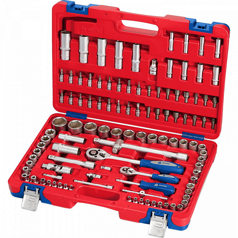 Головки торцевые стандартные 6-гранные 4, 4.5, 5, 5.5, 6, 7, 8, 9, 10, 11, 12, 13, 14 мм Головки торцевые глубокие 6-гранные 6, 7, 8, 9, 10, 11, 12, 13 мм Головки торцевые TORX Е-стандарт E4, E5, E6, E7, E8, E10 Трещотка флажковая с кнопкой 45 зубцов, длина 125 мм Вороток скользящий Т-образный длина 115 мм Удлинители стандартные 50, 100 мм Кардан 1 шт. Отвертка-вороток 150 мм Переходник адаптер для вставок (бит) F1/4 > F1/4"Вставки (биты) 5/16" (8 мм)