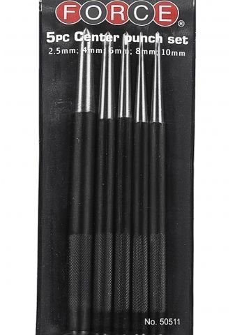 Набор кернов Force 50511 включает пять инструментов с диаметрами 2,5; 4; 6; 8 и 10 мм. Все керны имеют одинаковую длину — 185 мм. Комплектация: 5 предметов.