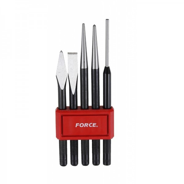 Набор 5054 от бренда Force включает пять инструментов: выколотки, зубило и крейцмейсель. Предназначен для точечной обработки материалов, разметки и вспомогательных работ в столярном и слесарном деле.