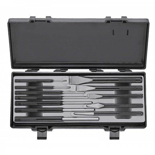 Набор инструментов Force 51229 включает 12 изделий: 3 зубила, 7 пробойников, 1 керн и 1 крейцмейсель. Все инструменты упакованы в удобный кейс для хранения и транспортировки.