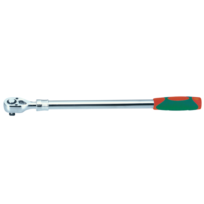 Трещотка имеет телескопическую конструкцию, что позволяет увеличить рычаг и прикладывать большие усилия, затрачивая при этом минимум сил.