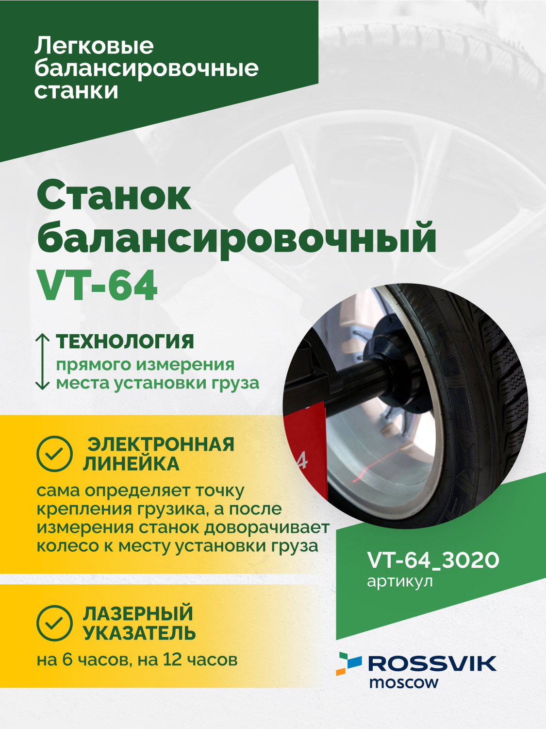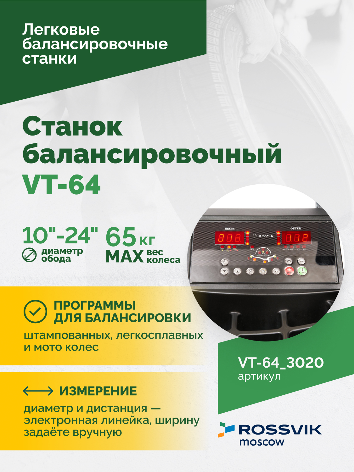 Станок балансировочный ROSSVIK VT-64, 220В, RAL3020 КРАСНЫЙ<br />- озвучено все меню, включая меню калибровки<br />- прямое измерение места установки груза ALU-S<br />- электронная линейка для автоматического ввода параметров (дистанция, диаметр)<br />- автодоворот до места установки груза<br />- защитный кожух<br />- быстросъемная гайка<br />- лазерный указатель места установки грузов<br />- 3 варианта установки грузов (на 6 часов, на 12 часов, линейкой)<br />- быстрый привод, время измерения дисбаланса всего 8 секунд.