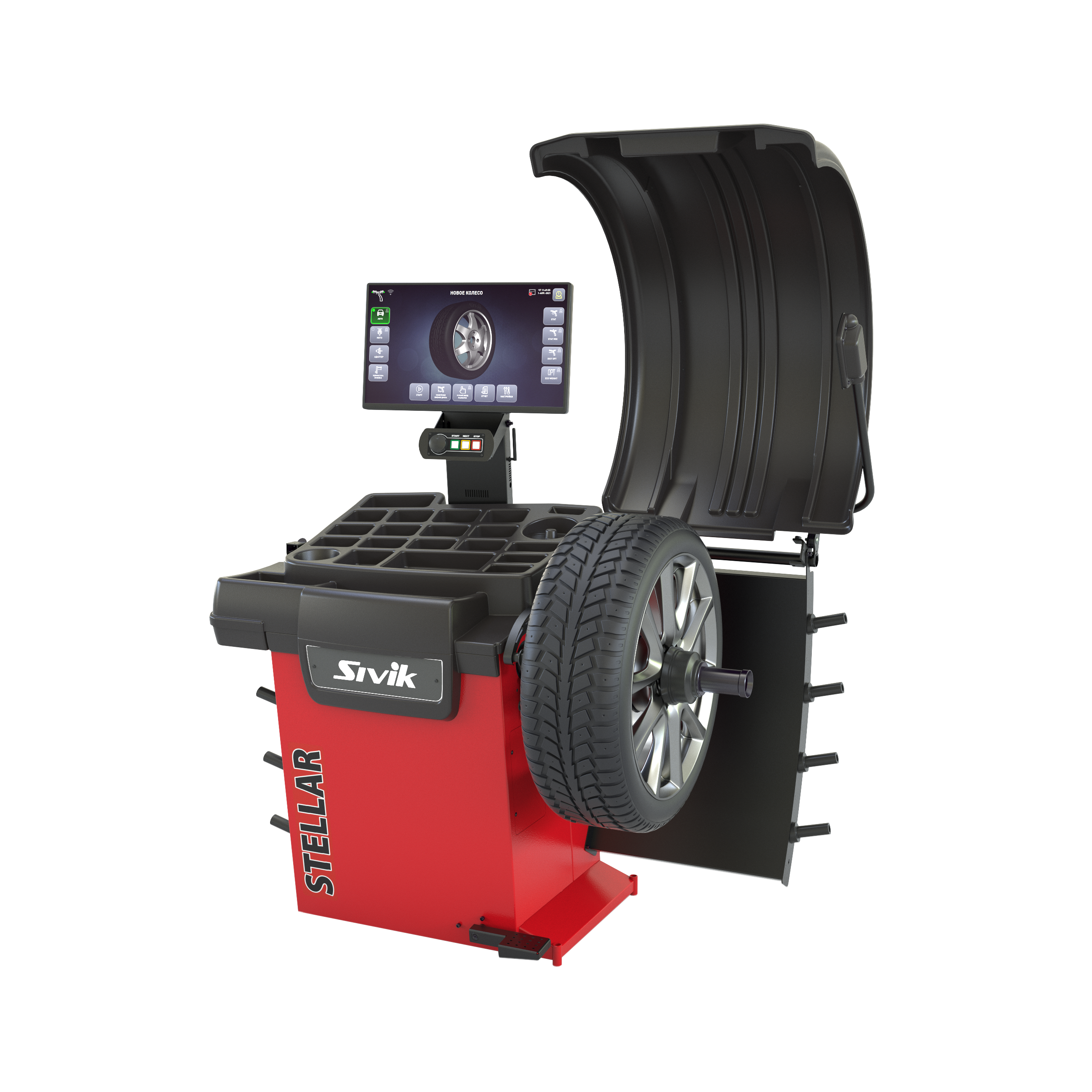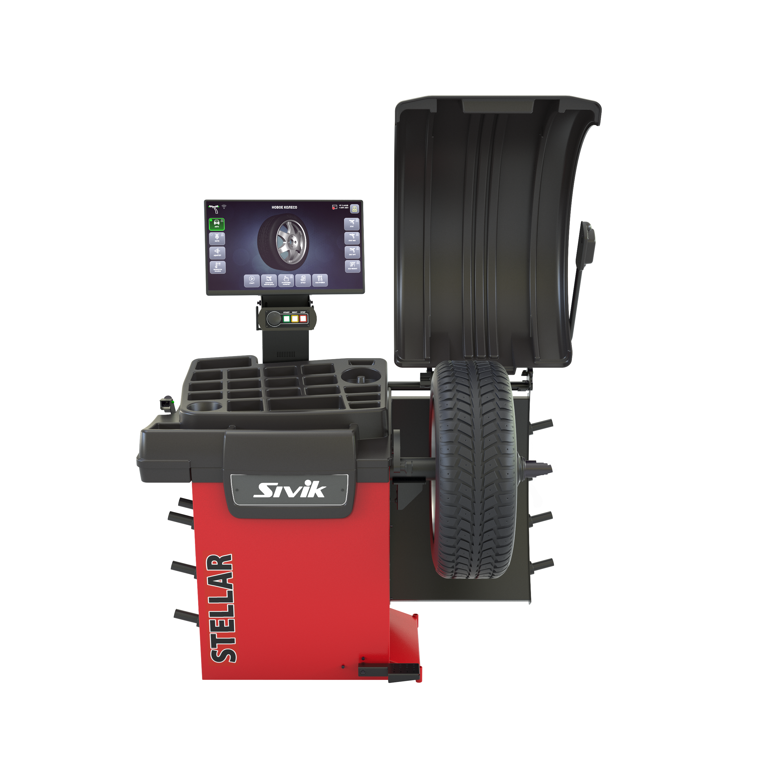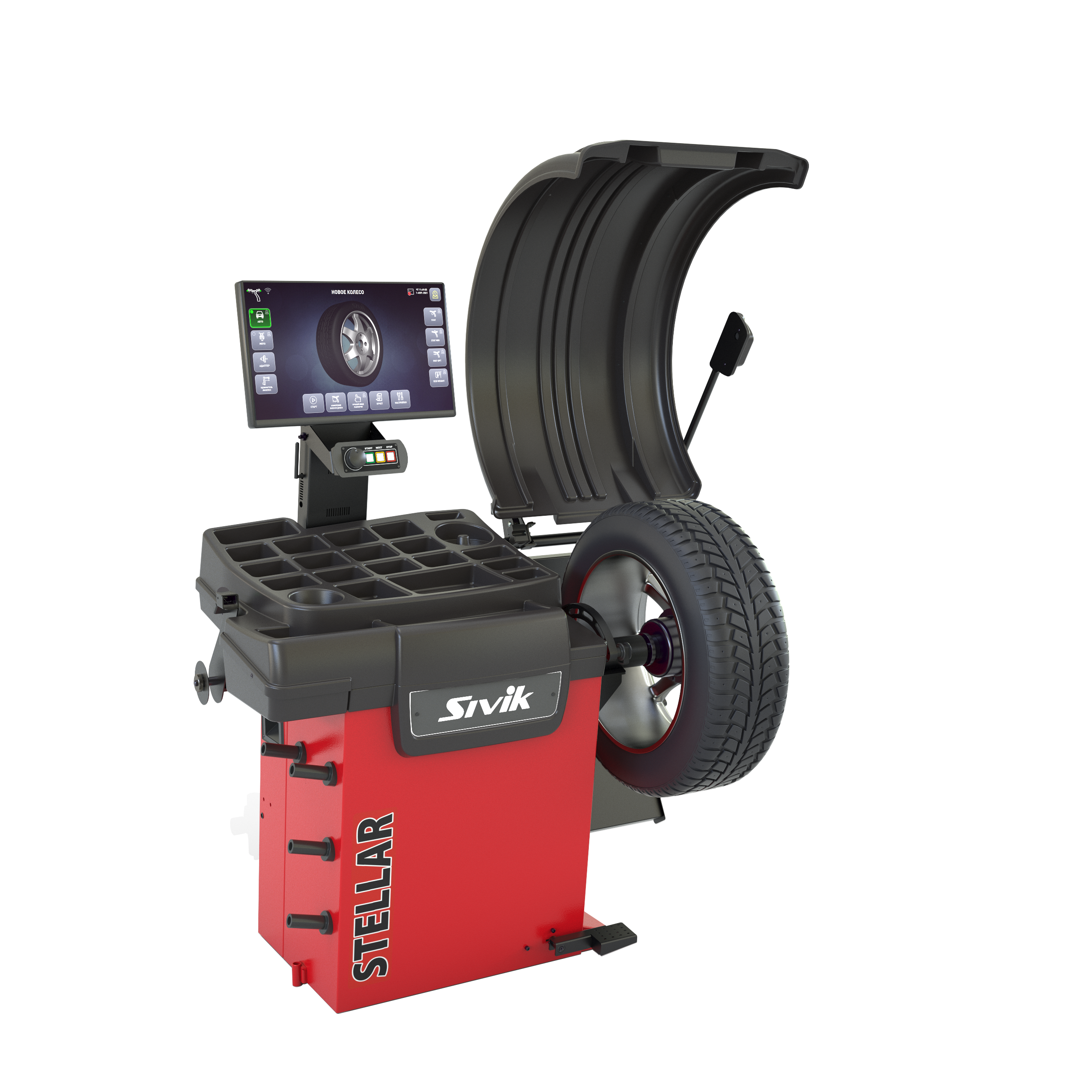 - Пневматический вал станка STELLAR (p) зажимает колесо очень быстро, экономя время при балансировке каждого колеса.