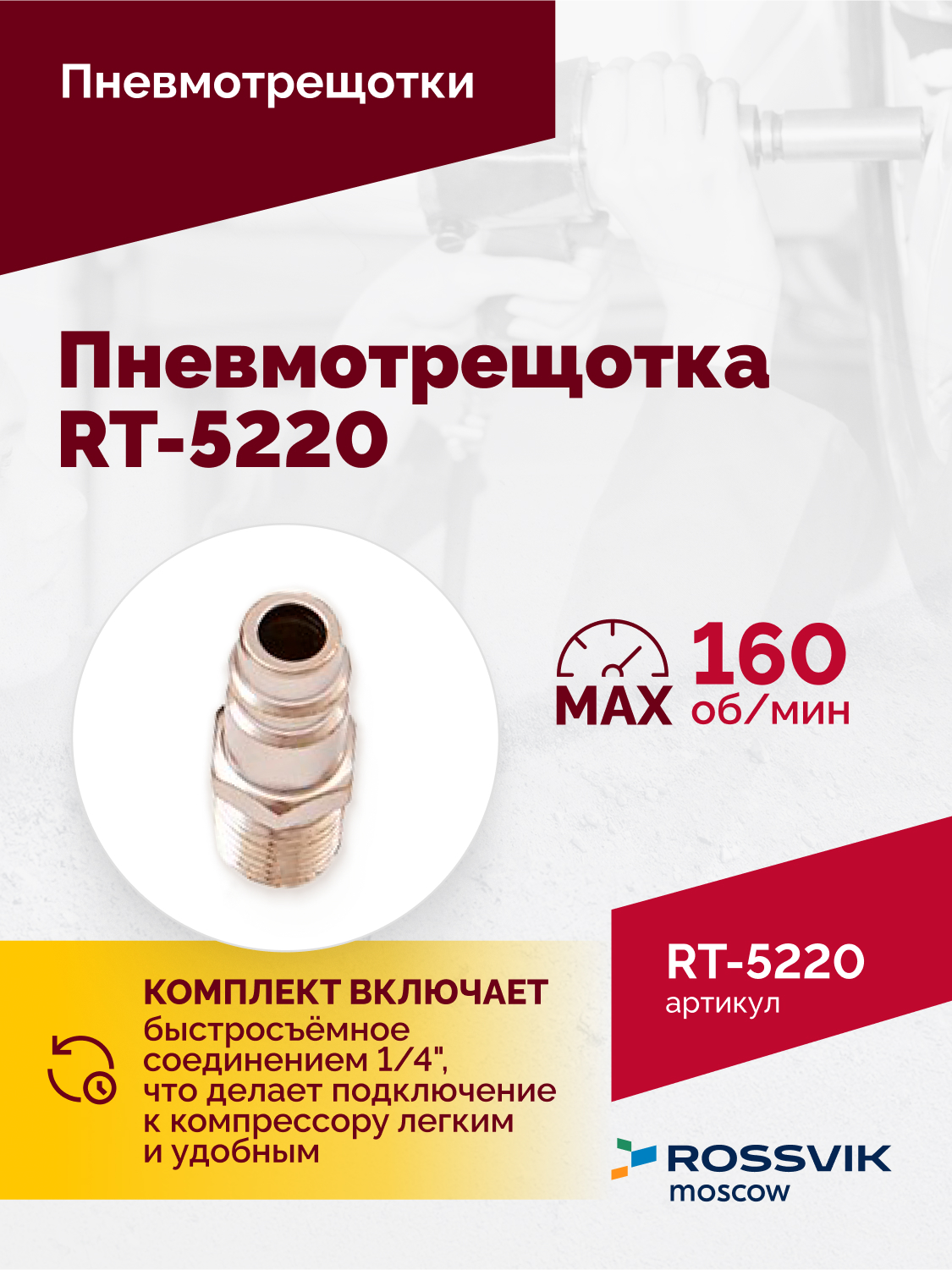 Пневмотрещотка RT-5220, 1/2", 68Нм, 160об/мин, 115л/мин, 6,2бар, 1,2кг<br />Технические характеристики:<br />Шпиндель - 1/2"<br />Максимальное усилие - 68 Нм<br />Максимальное давление на входе - 6,2 бар<br />Расход воздуха - 115л/мин<br />Количество оборотов - 160 об/мин<br />Вес - 1,2 кг.