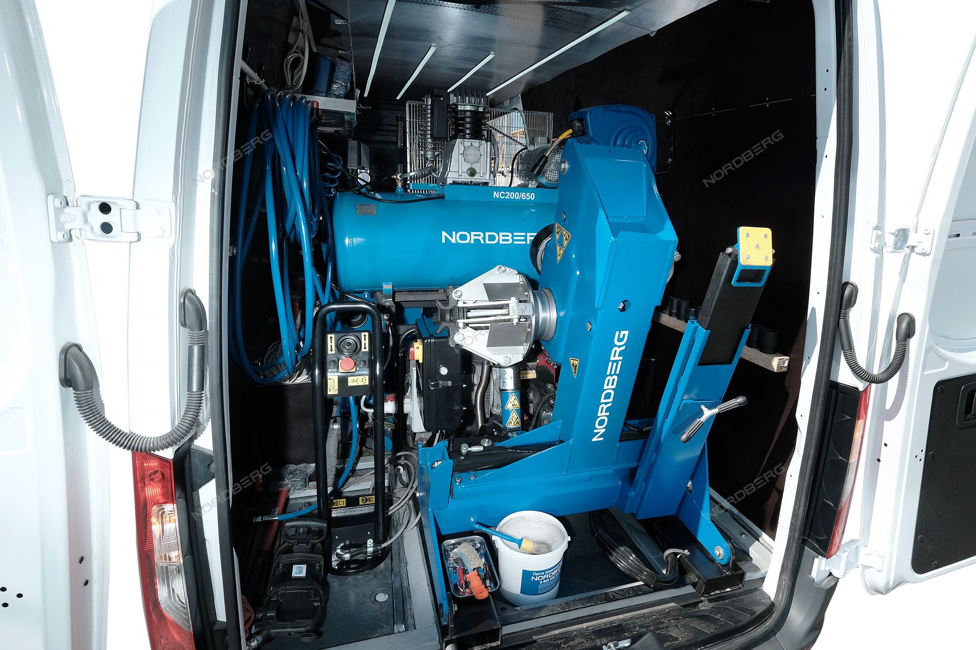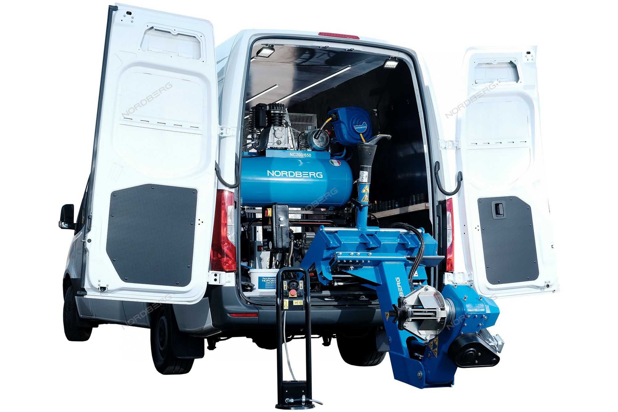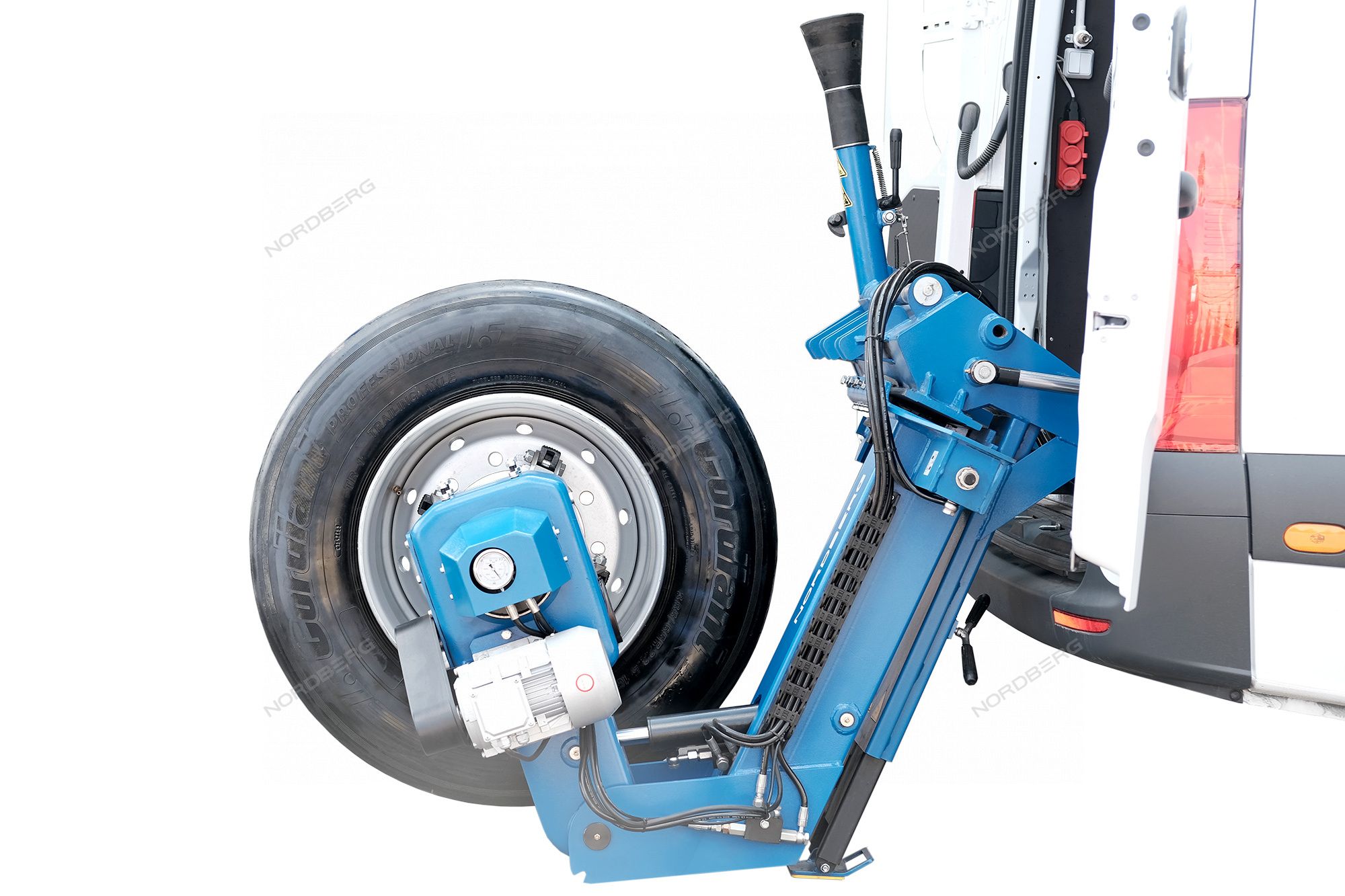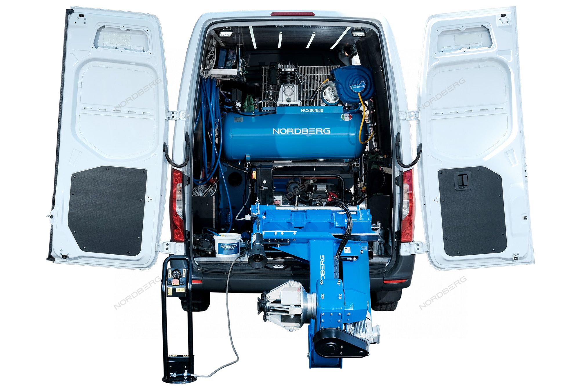 - В рабочем положении консоль зажимного устройства наклоняется за пределы двери фургона, что обеспечивает достаточно пространства для нормальной работы с большими колесами, а минимальная рабочая высота - отсутствие необходимости подъема колес.