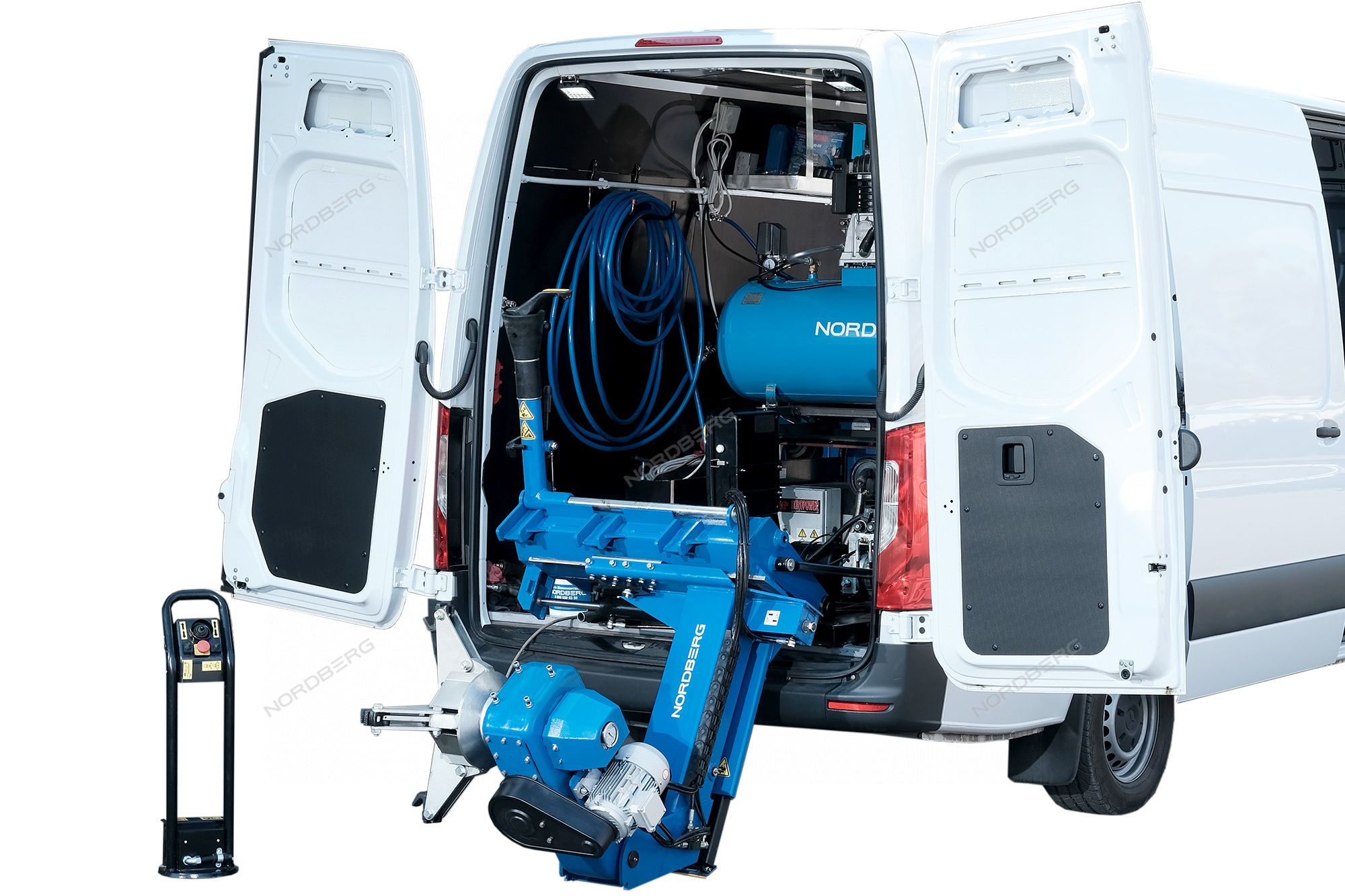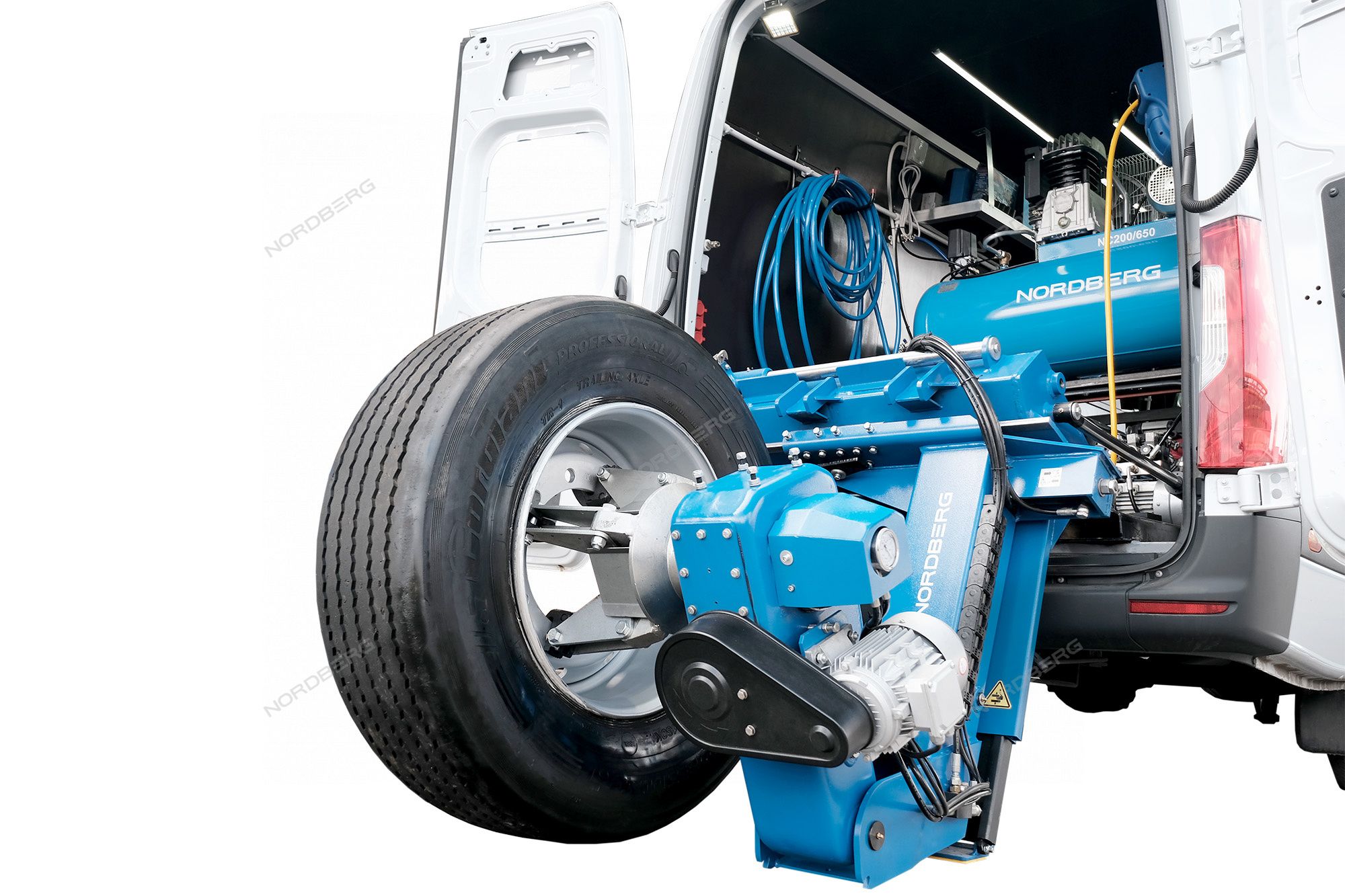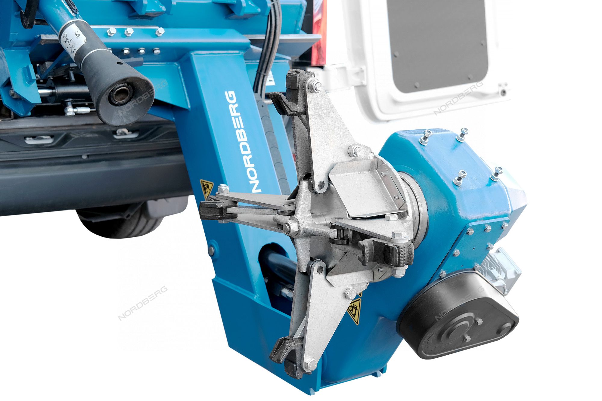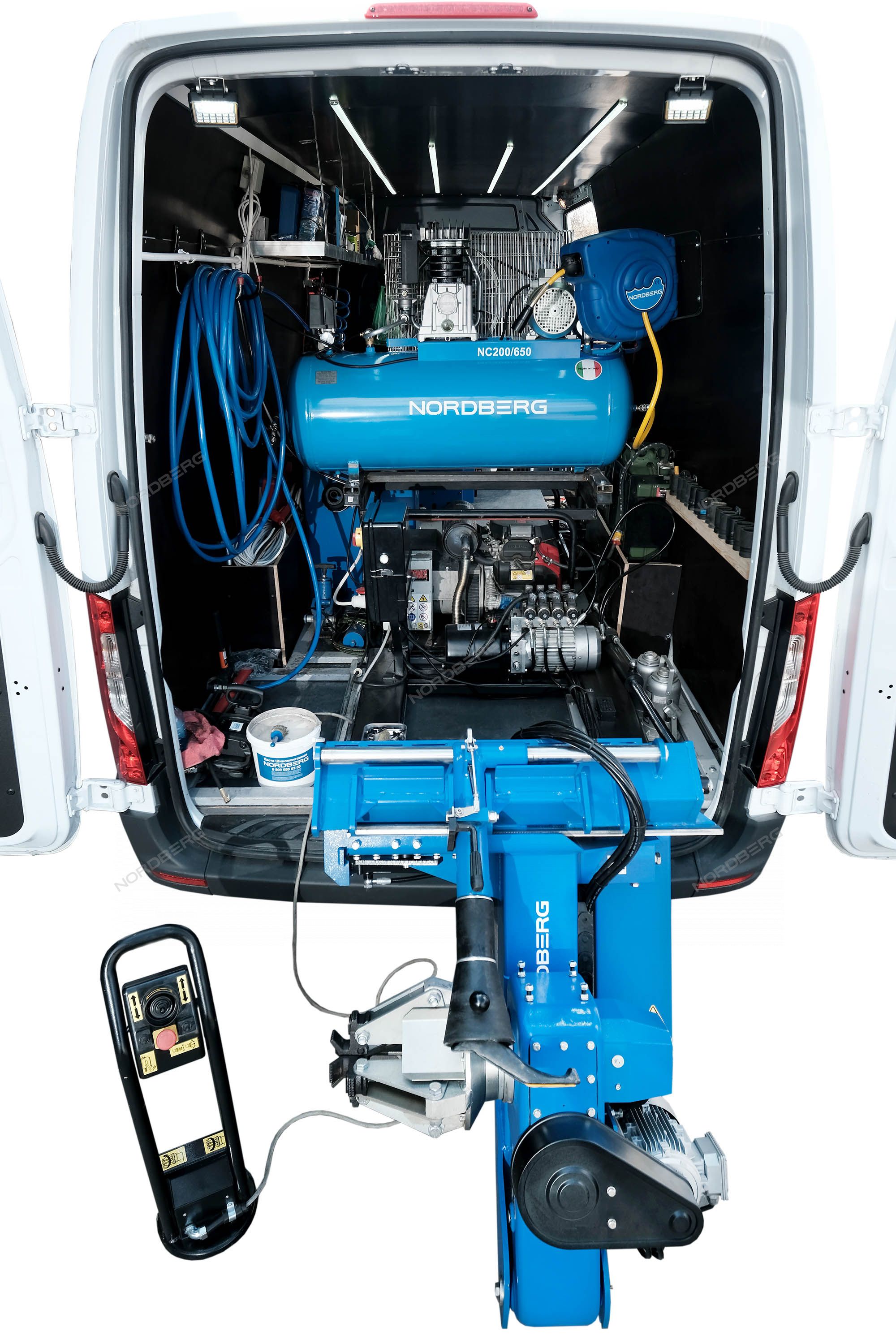 - В рабочем положении консоль зажимного устройства наклоняется за пределы двери фургона, что обеспечивает достаточно пространства для нормальной работы с большими колесами, а минимальная рабочая высота - отсутствие необходимости подъема колес.