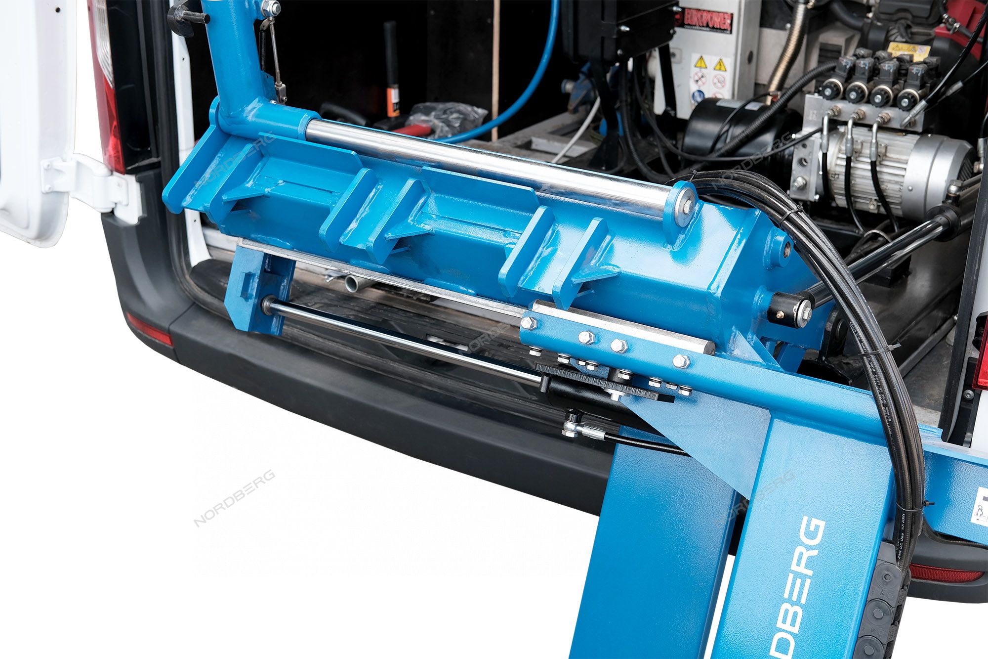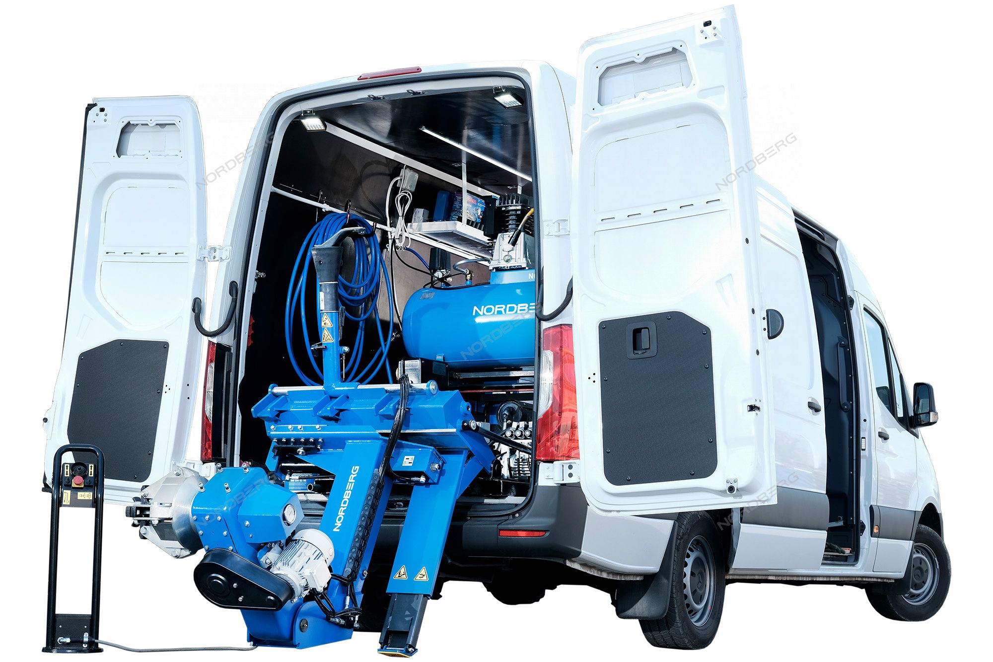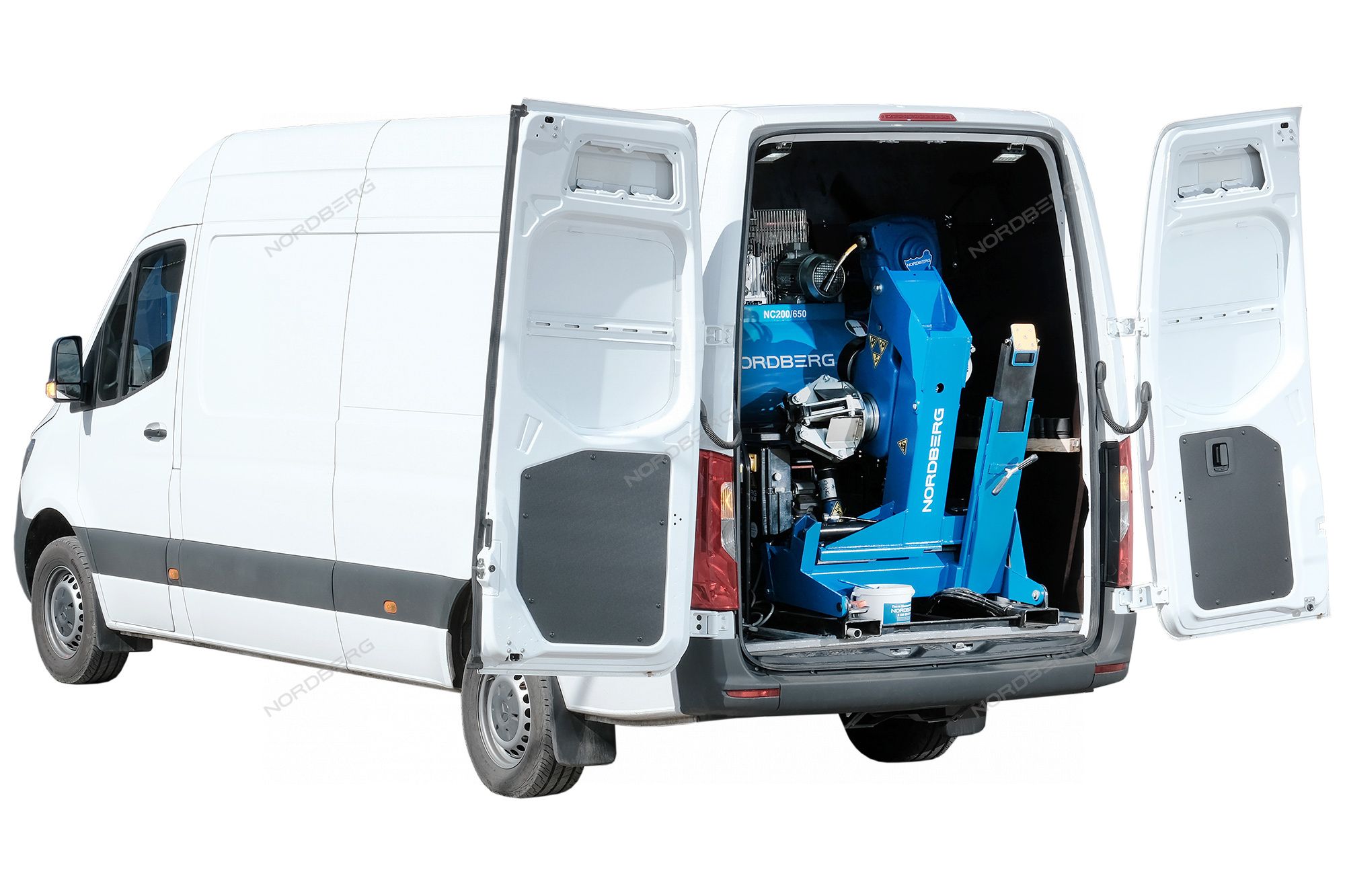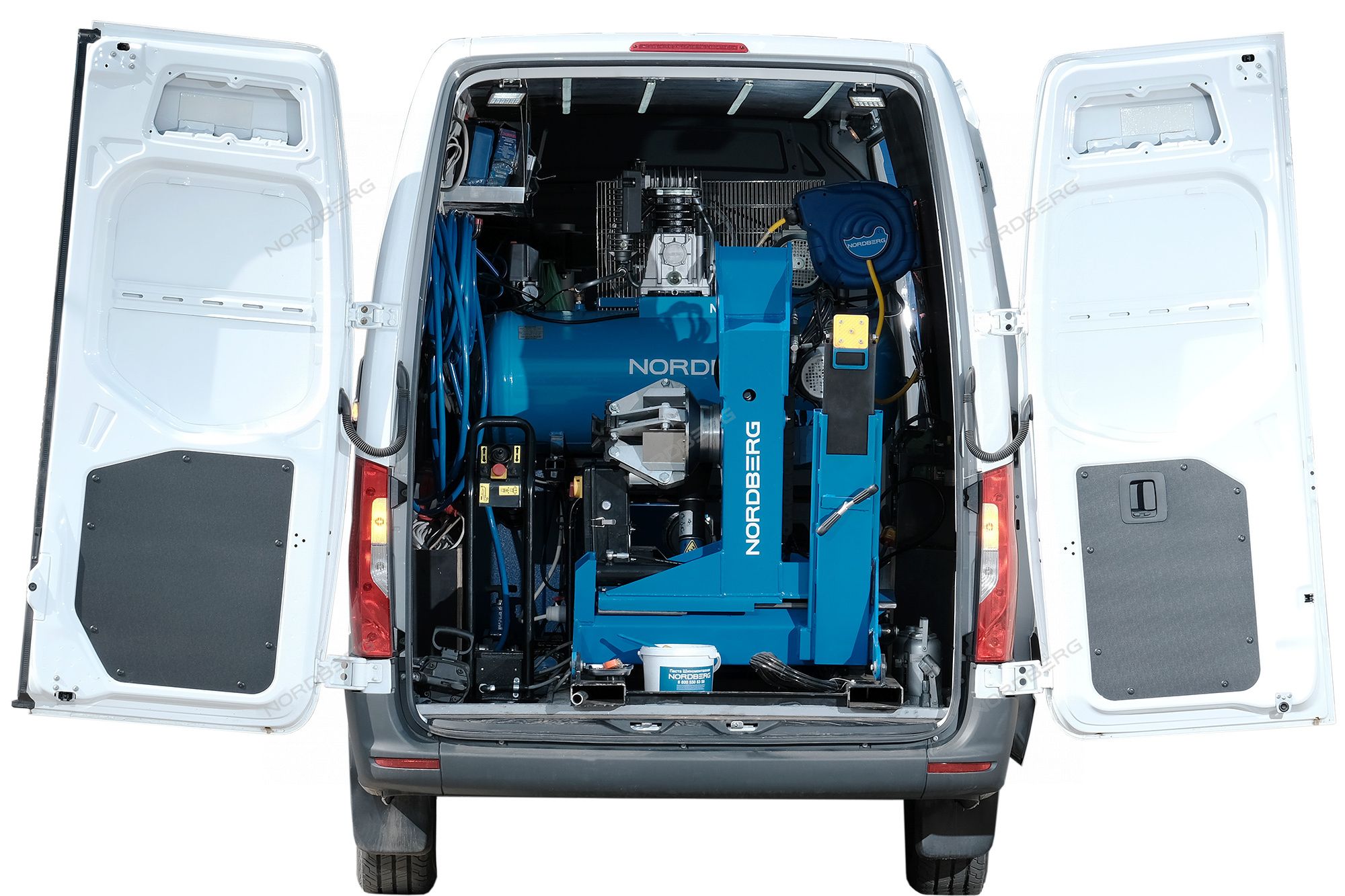 - В рабочем положении консоль зажимного устройства наклоняется за пределы двери фургона, что обеспечивает достаточно пространства для нормальной работы с большими колесами, а минимальная рабочая высота - отсутствие необходимости подъема колес.