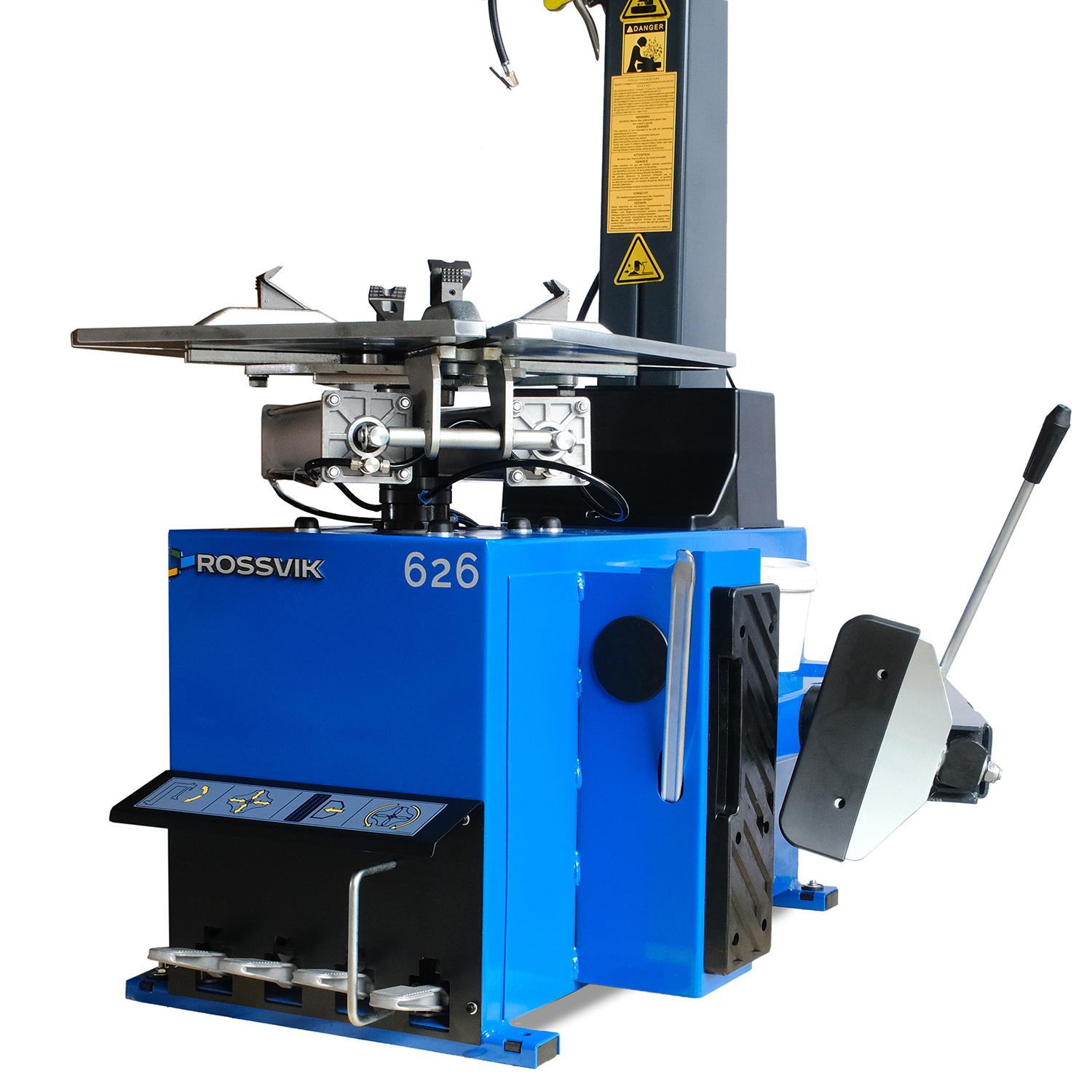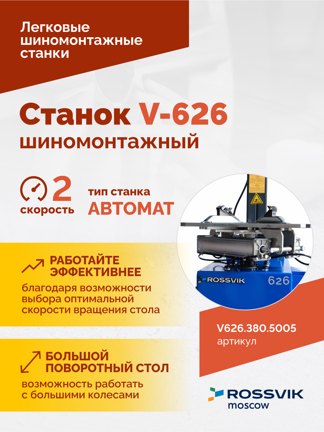 Станок шиномонтажный ROSSVIK V-626, автомат, до 26", 380В, 2 скорости — это мощное и надежное оборудование, предназначенное для профессионального обслуживания шин. Этот станок обладает рядом преимуществ, которые делают его незаменимым инструментом в автосервисе.<br /><br />2 скорости вращения позволяют гибко подходить к процессу шиномонтажа, ускоряя работу с различными типами шин.<br />Поворотный стол с гальваническим покрытием обеспечивает долговечность и надежность работы, а шиномонтажные зажимные кулачки и головка с пластиковым протектором защищают диск при монтаже/демонтаже автошины. Это особенно важно для сохранения целостности диска и предотвращения его повреждений.<br />Оснащение блоком подготовки воздуха, включающим регулятор давления, масловлагоотделитель и лубрикатор, позволяет точно настроить параметры воздуха и обеспечить качественное обслуживание шин.<br />Монтажная головка, позиционируется относительно обода по горизонтали и вертикали, обеспечивает гибкость и точность работы.<br />Реверсивный переключатель с посеребрянными контактами способен выдерживать длительную высокую нагрузку, что гарантирует долговечность и надежность работы станка.<br />Откидывающаяся назад стойка облегчает доступ к колесу и упрощает процесс монтажа/демонтажа шин.<br />Станок имеет стильный и современный внешний вид, что важно для создания положительного впечатления у клиентов.<br /><br />Низкий уровень шума в 75dB делает работу на станке комфортной для оператора.<br />Вес нетто в 260кг и брутто в 295кг обеспечивают устойчивость и надежность конструкции.<br />Размер в упаковке 1100*860*1020мм позволяет удобно транспортировать и хранить станок.<br /><br />Возможность комплектации вспомогательным устройством V624.R для работы с низкопрофильными шинами расширяет функциональность станка.<br /><br />Гарантия на шиномонтажные станки ROSSVIK – 2 года, что подтверждает высокое качество и надежность оборудования.